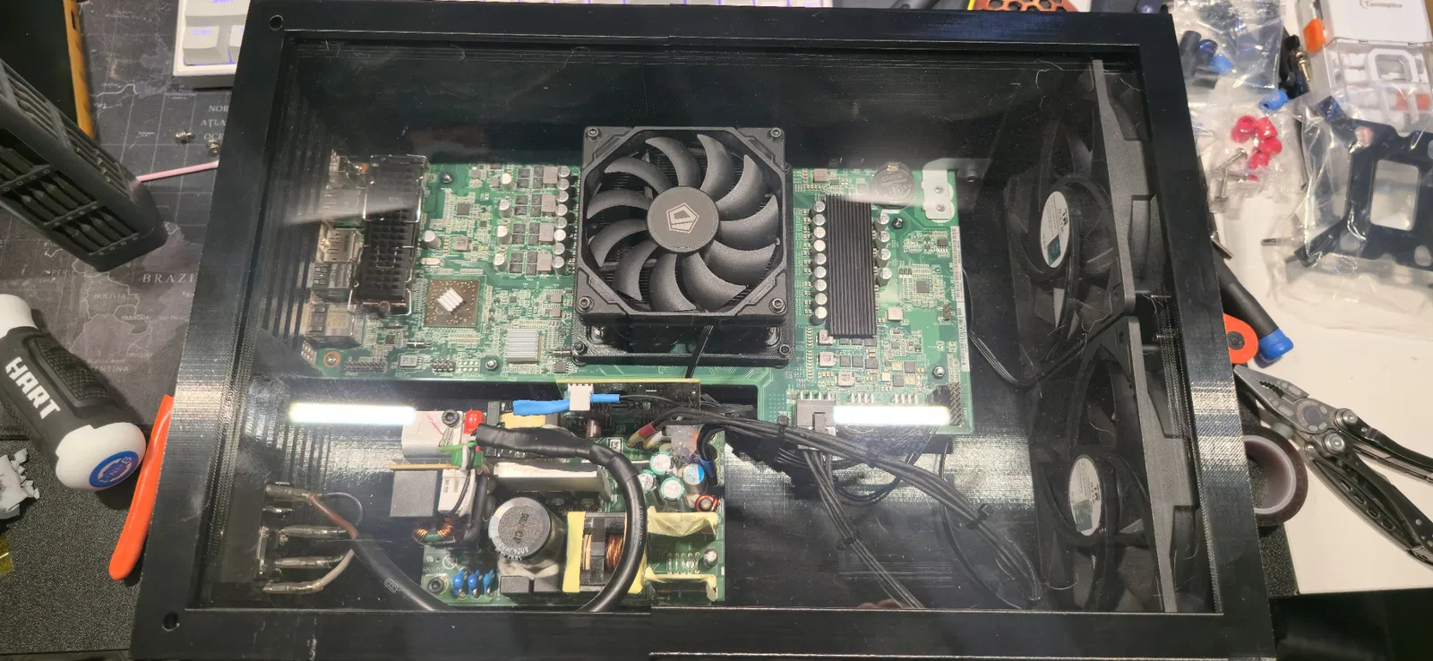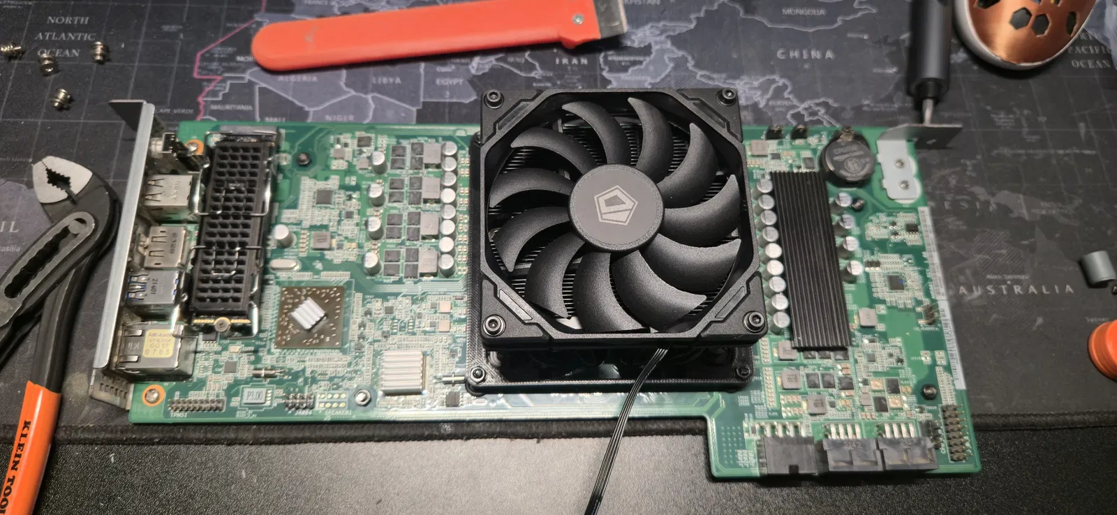 Adapter in 3D để gắn CPU cooler cho board AMD BC-250. Khi test, nhiệt độ tối đa giảm từ 92°C xuống 72°C. Dùng ngàm Intel (loại dài) bắt vào adapter, lắp bằng đai ốc và bu lông M4.