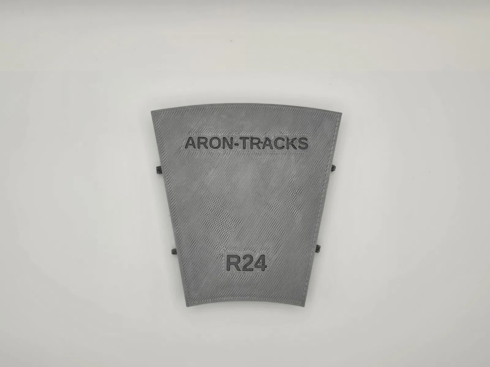 Mẫu ray R24 có ballast đầy đủ tương thích LEGO. Khớp nối trục giúp tăng độ cứng và canh thẳng hàng; phần khoét để nối với ray thường vì in clip trên ballast plate dễ bị quá cứng. Cần 16 miếng cho 1 vòng tròn, không cần support.