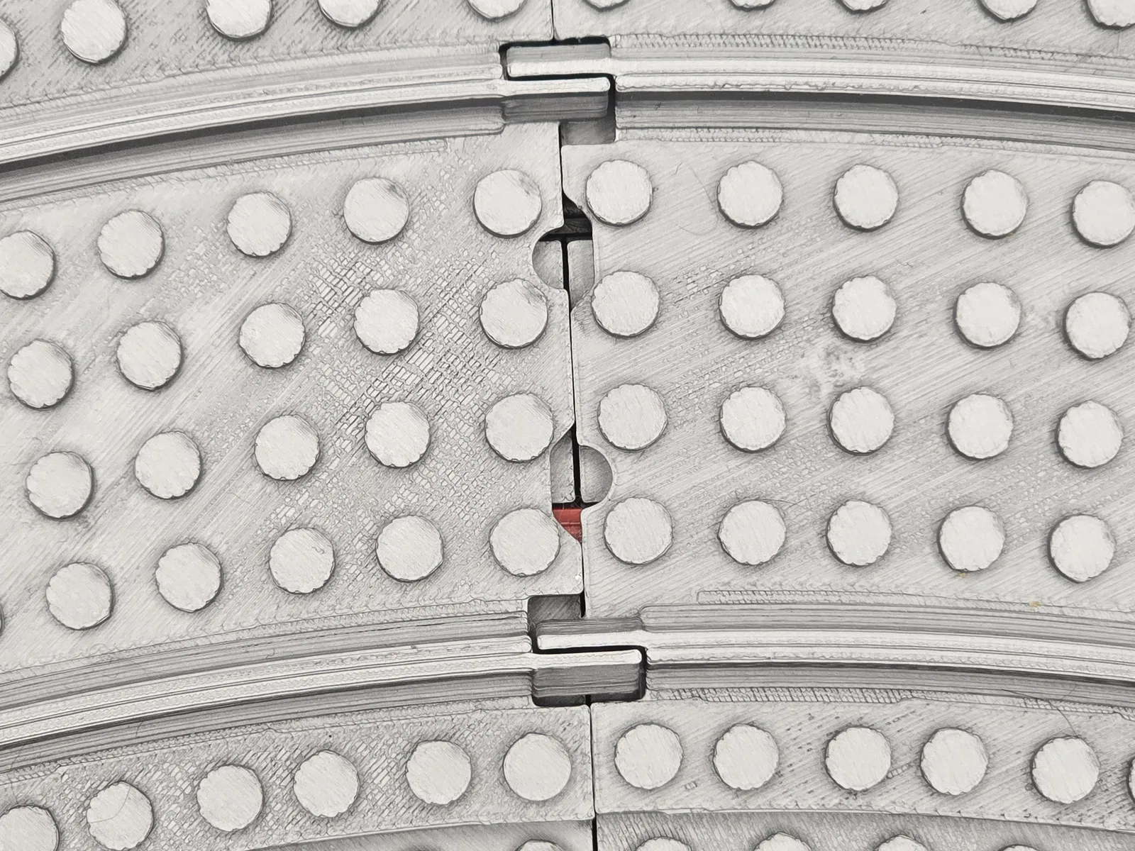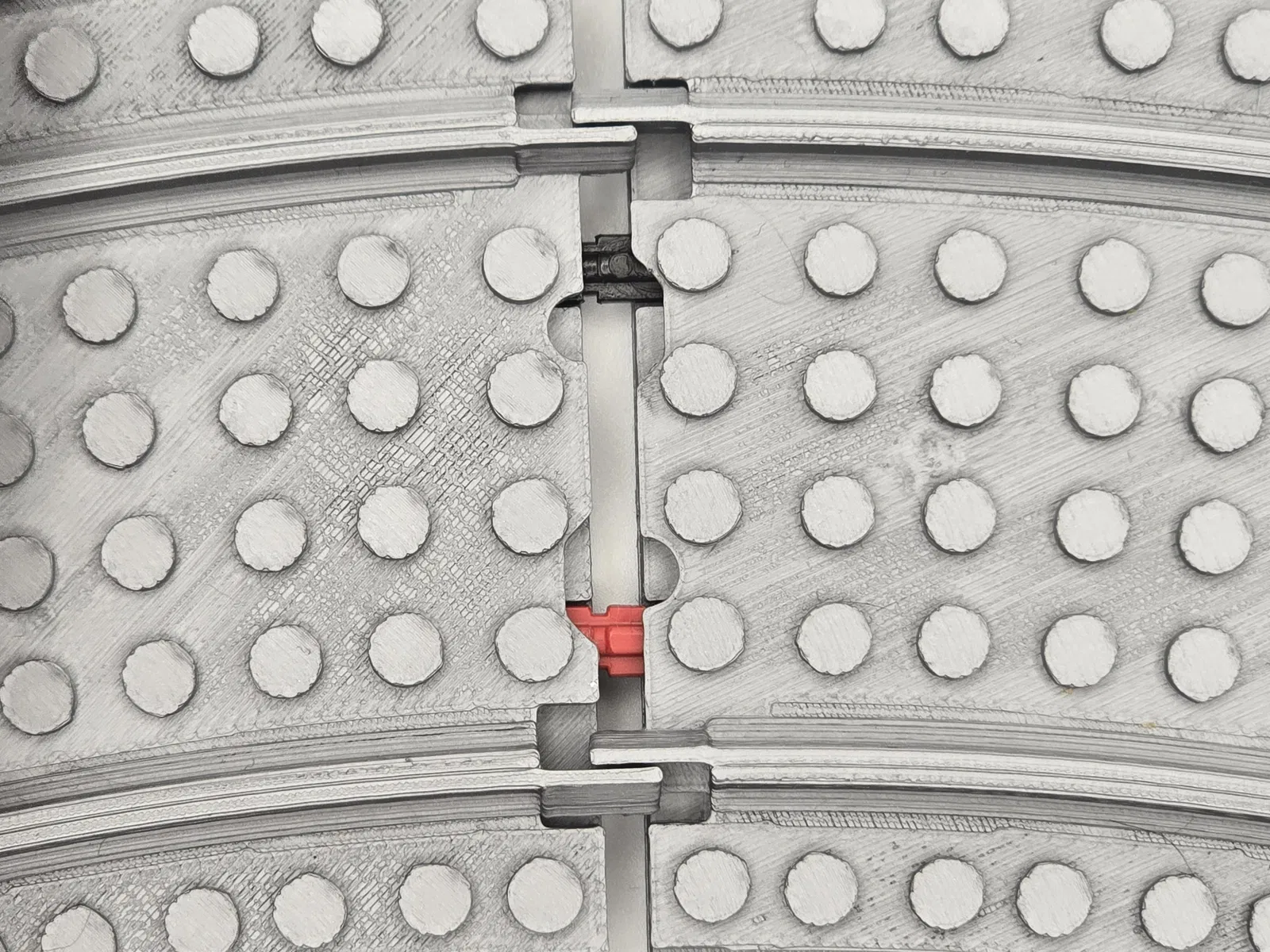 Các phần khoét dùng để nối với ray thường, vì nếu in luôn các ngàm kẹp (clips) trên tấm ballast plate thì sẽ bị quá cứng, không hoạt động ổn.