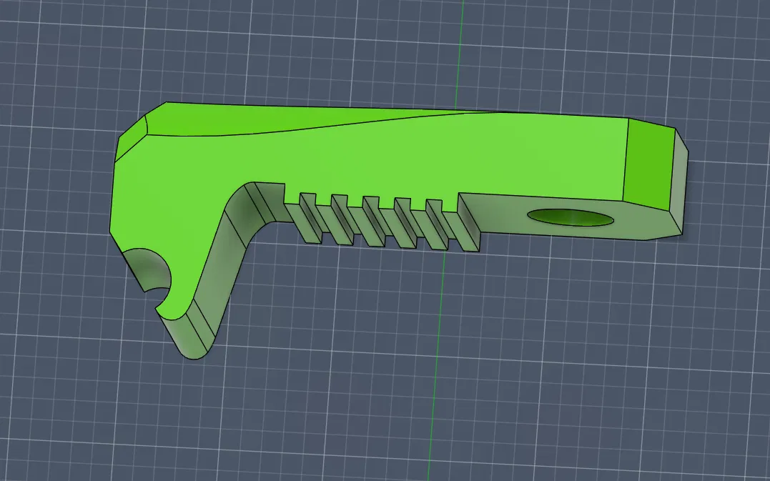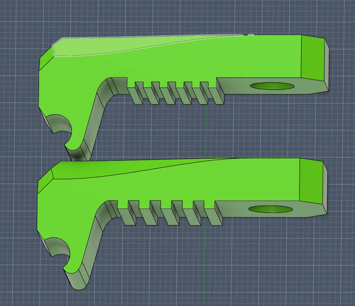 Mình theo dõi “cơn sốt” GT1.5 đang lan ra dạo này, nên cũng tò mò xem cần làm gì để gắn nó lên RR V-Core 3.1 của mình với Toolhead 1.0. Ngoài pulleys ra, đây là những phần duy nhất của máy được cho là sẽ chạm vào răng belt, nên mình chỉnh mấy món này để về lý thuyết có thể chạy được. Mình lo là khe belt tổng thể trên tensioner hơi chật, và cũng không chắc răng của front clamp sẽ bền cỡ nào. Mấy phần này sẽ cần ABS hoặc ASA được canh shrink offsets thật chuẩn, vì tổng độ dày belt GT1.5 là 1mm. Front clamp cũng được chỉnh dày thêm khoảng ~0.4 để bù cho belt mỏng hơn (và không cần phải in lại thêm nhiều phần), mà không chỉnh hình học chỗ cái lip móc vào con screw, cũng như vị trí con countersunk screw siết tì vào hông body.