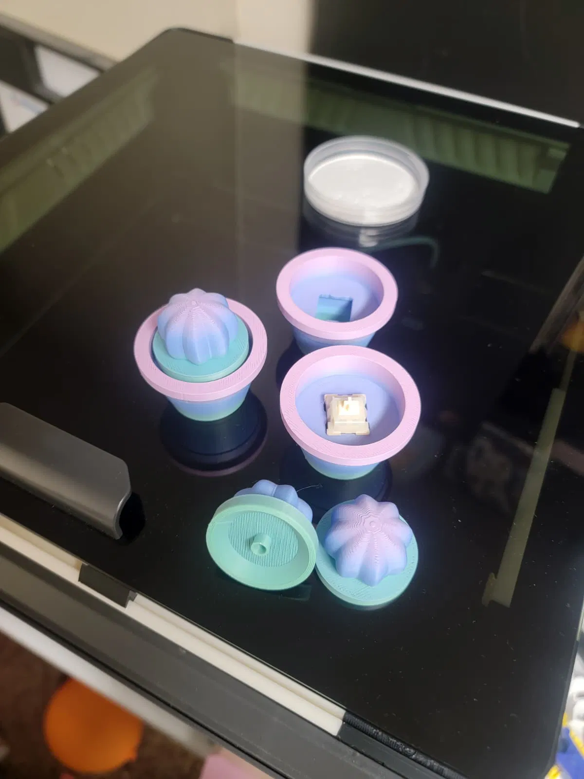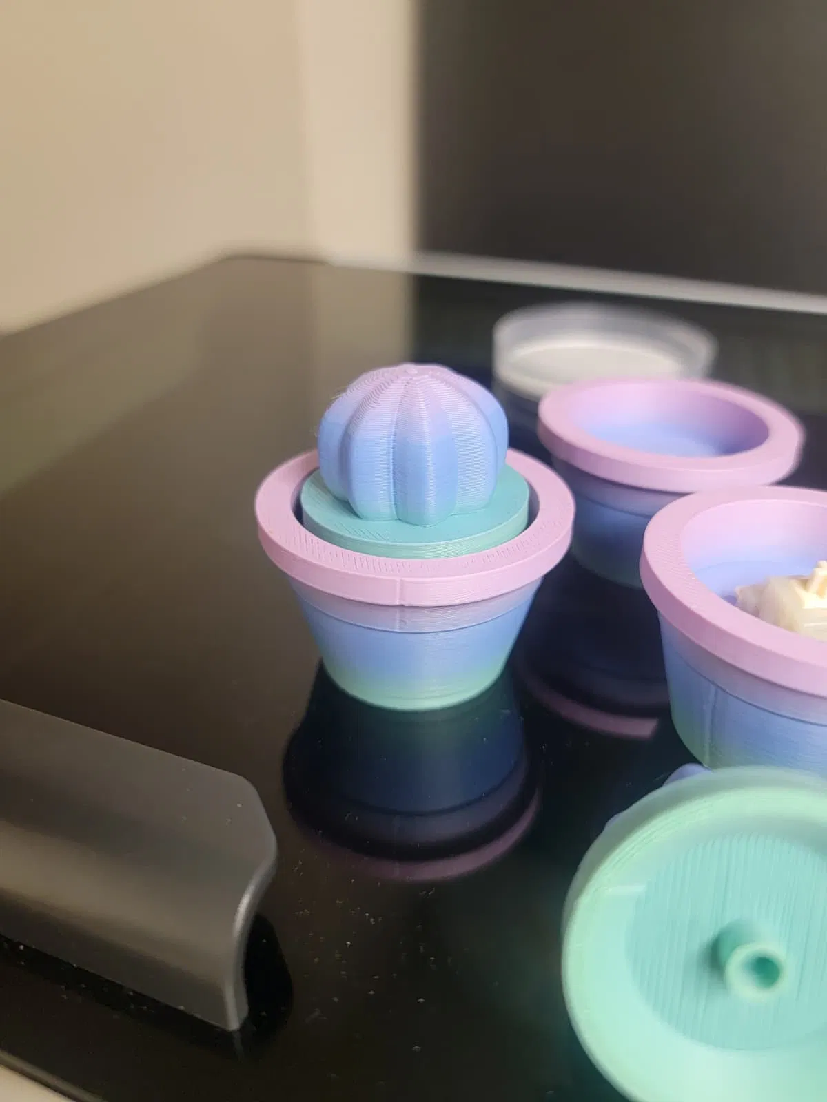Cần một mechanical keyboard switch, ngoài ra thì mọi thứ đều in được. Mình in không cần supports và thật ra vẫn ngon lành, nhất là vì bạn cũng không bao giờ thấy mặt đáy của cây xương rồng. Bạn chỉ cần in cái chậu và chọn một trong hai kiểu xương rồng: cao hoặc lùn.