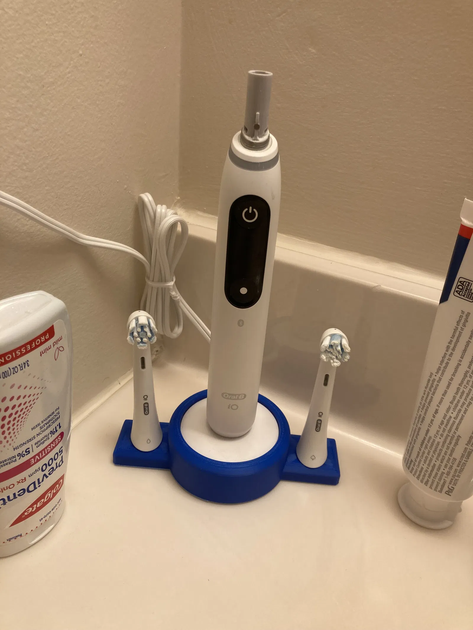 Mẫu giá đỡ cho đế sạc Oral-B iO/iQ dạng tròn, tích hợp chỗ giữ đầu bàn chải. Các lỗ thoát khí giúp đầu bàn chải khô nhanh, gọn gàng và vệ sinh hơn.
