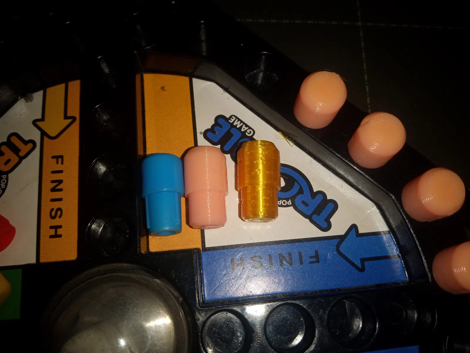 Quân cờ (peg) cho bộ game Trouble bản travel size của con trai mình.