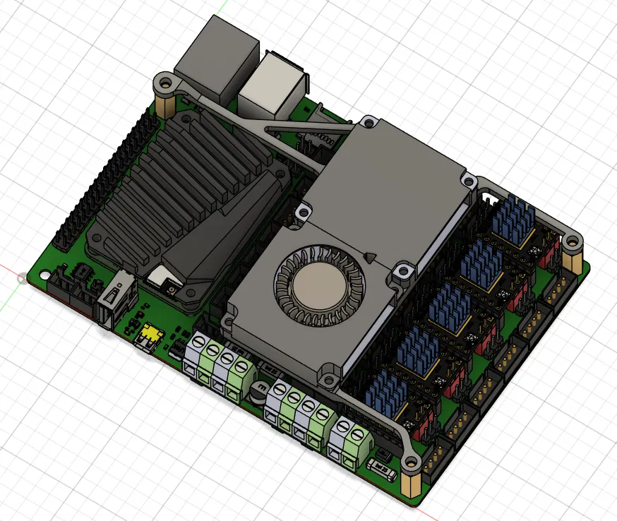 Mình đã làm lại hoàn toàn mẫu này, vì mình muốn in dễ hơn với ít phần bridging hơn và đổi hướng gá quạt. Một trong các quạt được lật ngược để thổi/đẩy khí nóng từ phía trên MCU ra ngoài. Mình cũng muốn dùng standoffs, vì có thể để chúng bắt vít cố định sẵn và giữ Manta đúng vị trí khi bạn tháo fan mount ra.