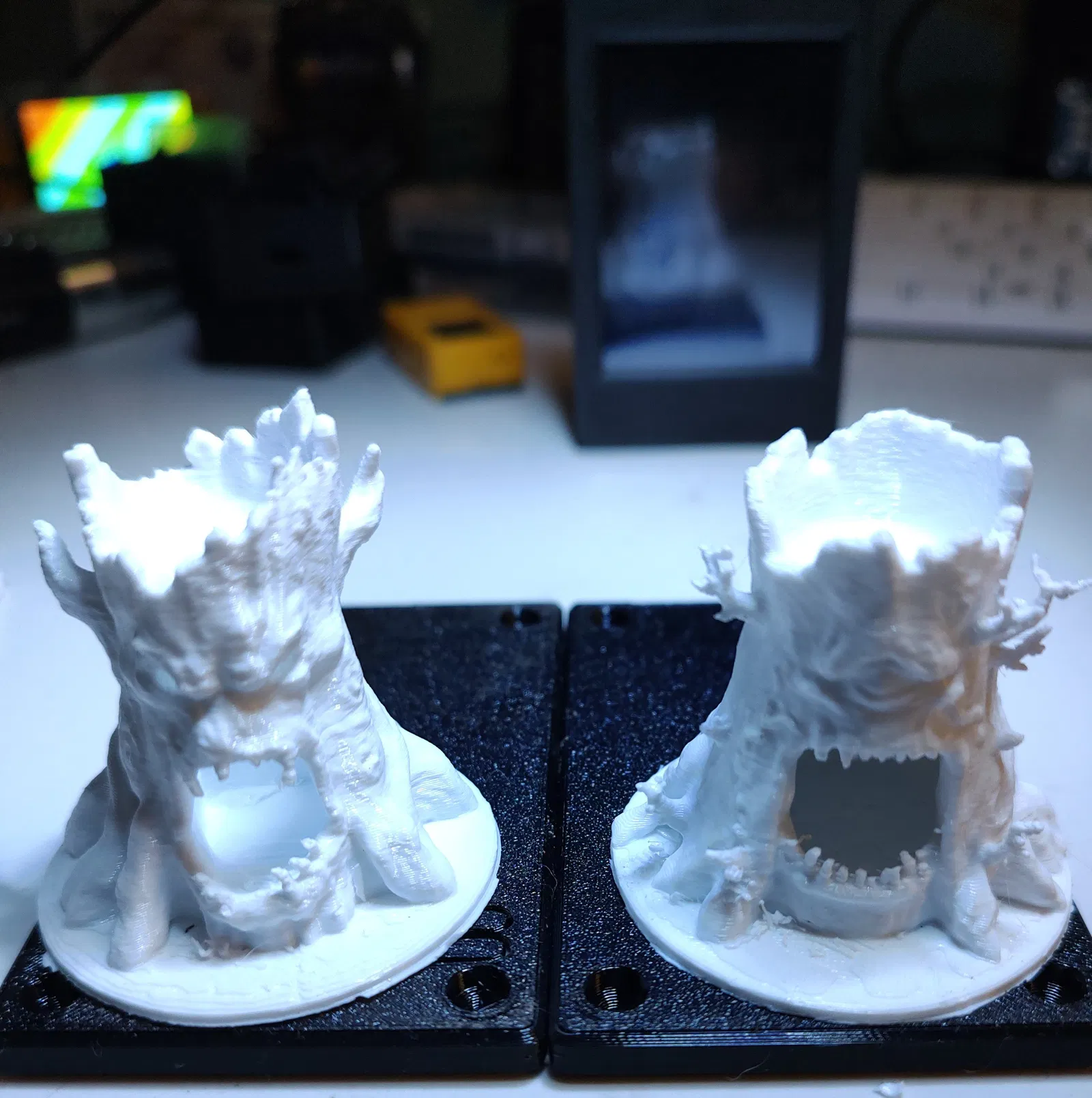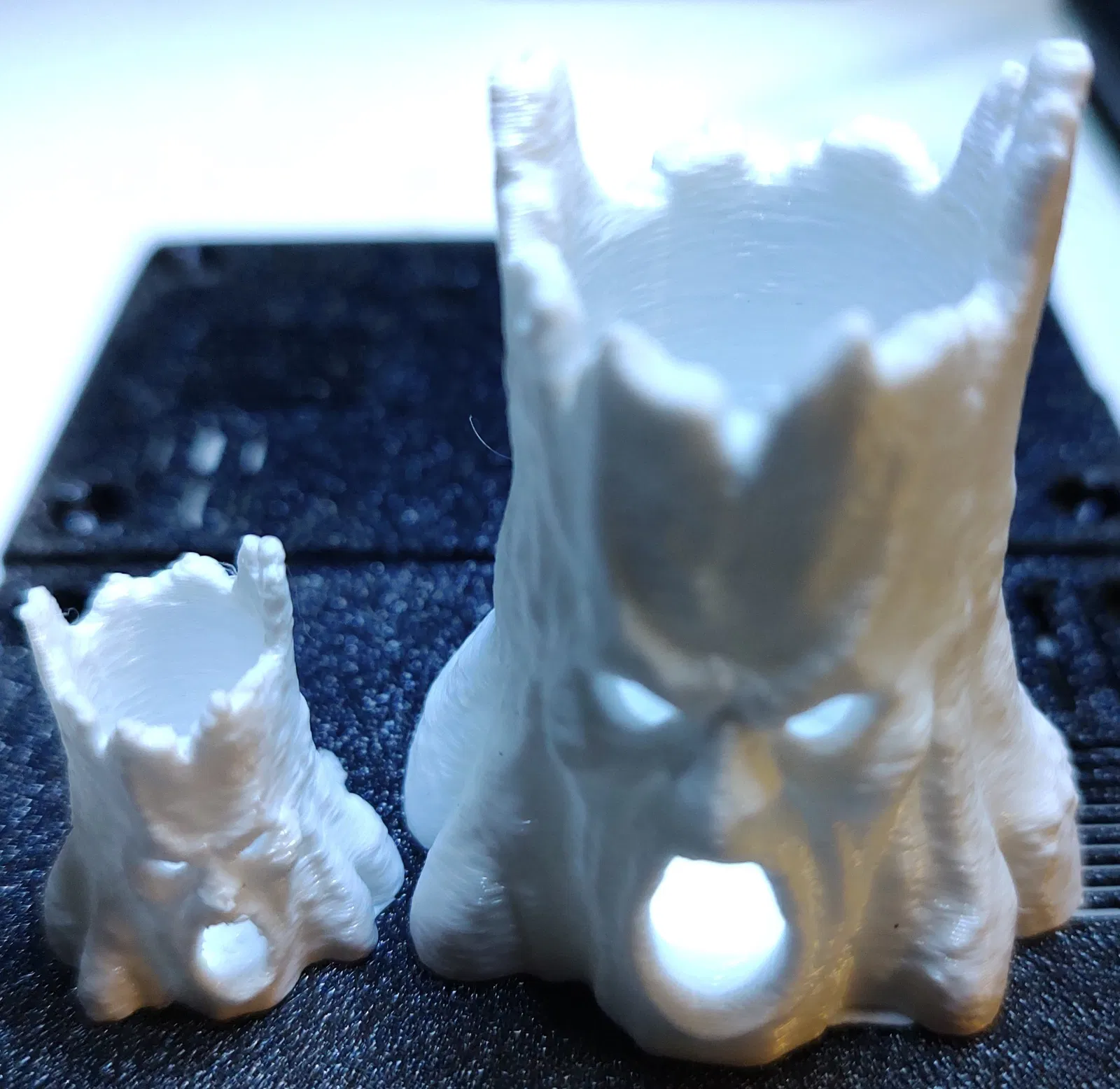 Lưu ý: đây là vài dự án 3D printer đầu tiên mình làm, mình cũng mới chơi 3D printing. Khi scale 50% thì phần răng khá dễ gãy. Mình cũng không chắc mình set support đã đúng chưa, hoặc in 100% thì có ổn hơn không. Chắc là có, nhưng mình không cần bản to vậy. Vì vậy mình để luôn slicer settings phòng khi bạn gặp tình trạng support bên trong miệng bị dựng thành một “khung” quá lớn. Mình vẫn phải cắt cẩn thận ra làm 2 mảnh.