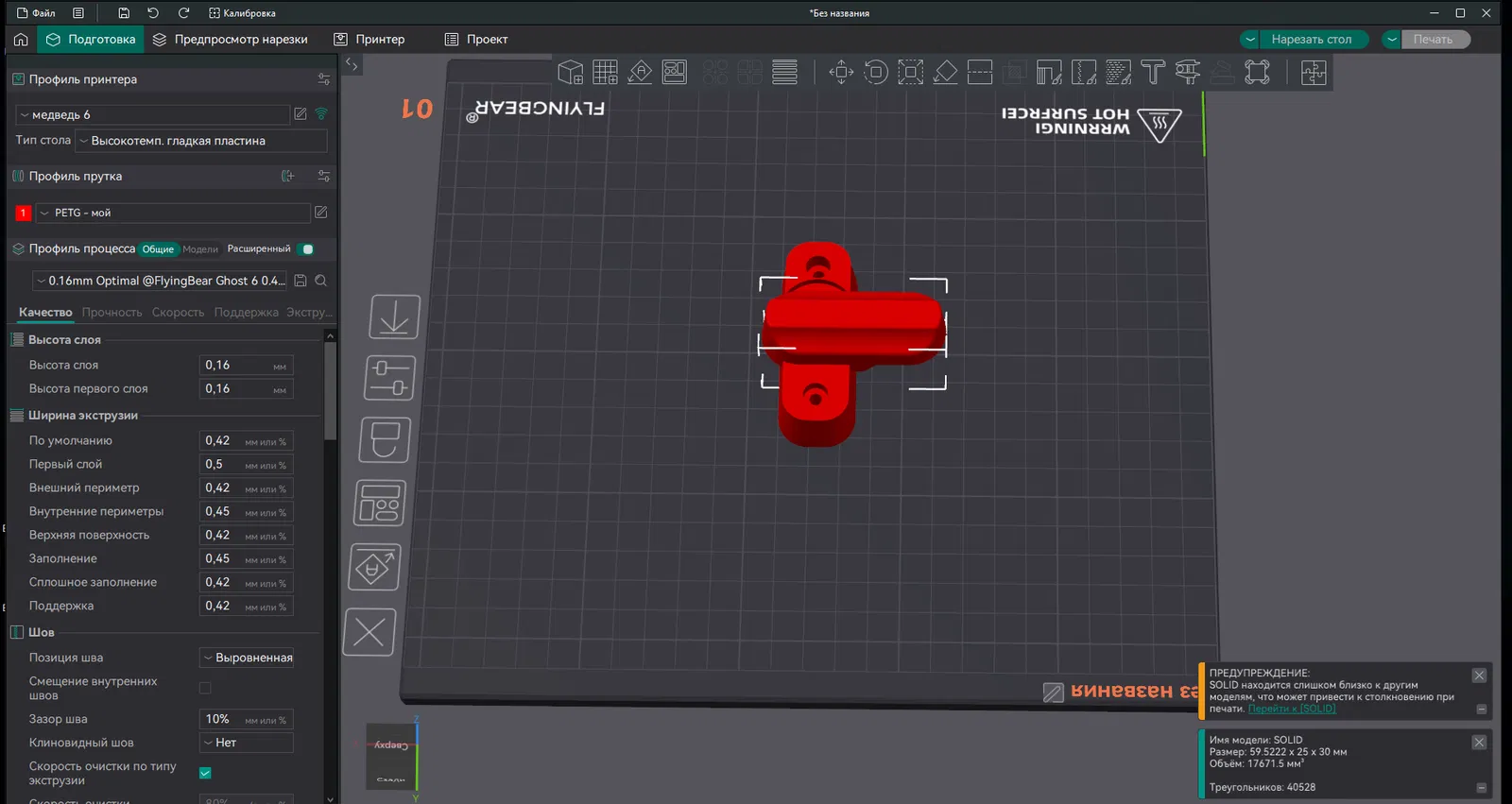 In bằng PETG hoặc ABS tùy điều kiện. Thiết lập 5 lớp (perimeters) và infill 40%. Nên tách phần lắp ráp ra thành từng model để in riêng từng chi tiết rồi mới ráp lại.