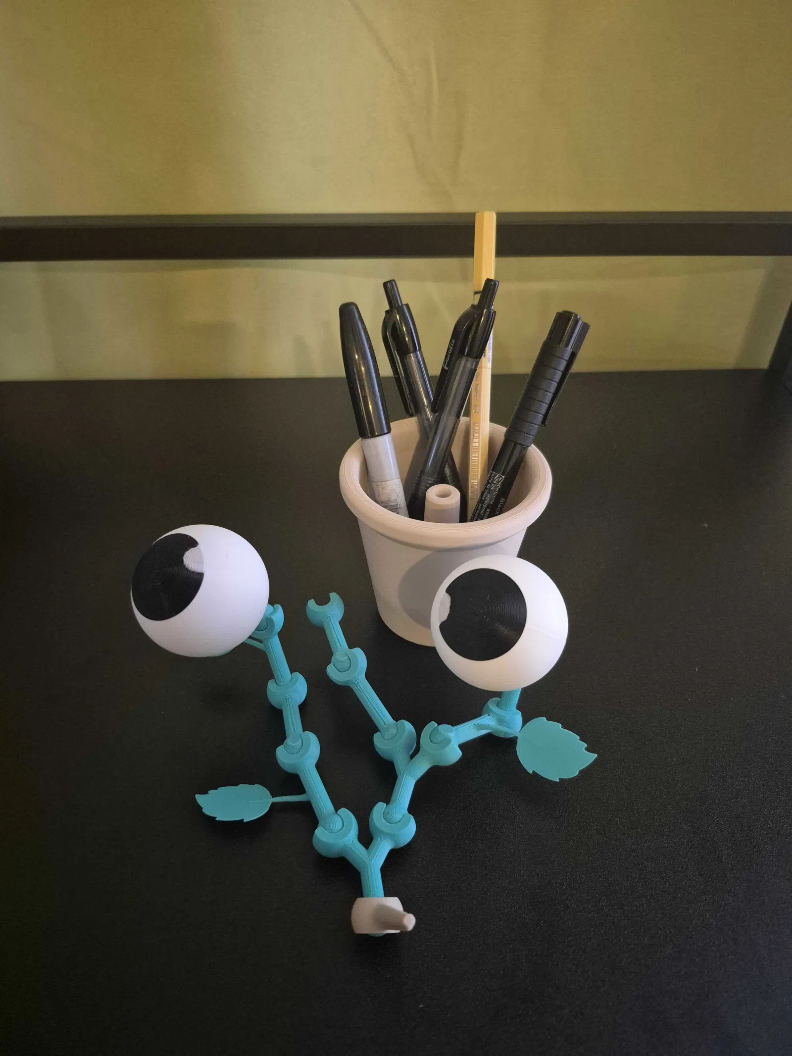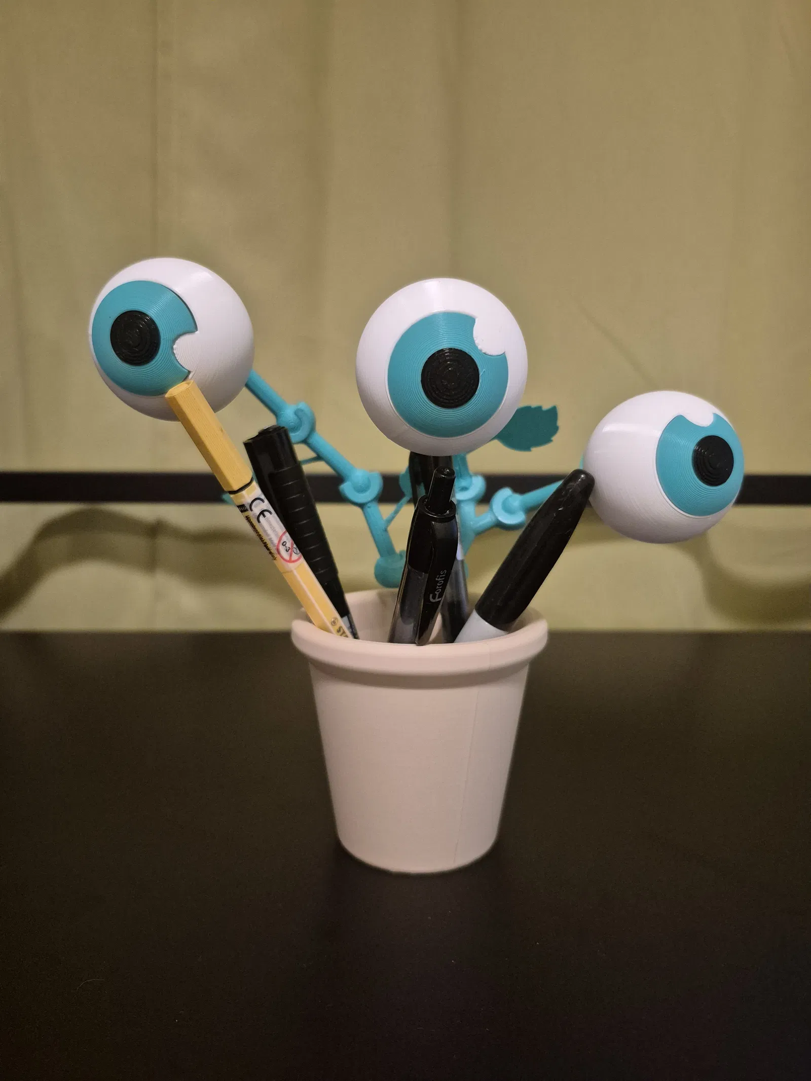 Mẫu 3D này vừa vui nhộn vừa rờn rợn cho dịp Halloween: một chậu hoa/ống cắm bút với tay khớp (articulated) đang cầm một con mắt.
