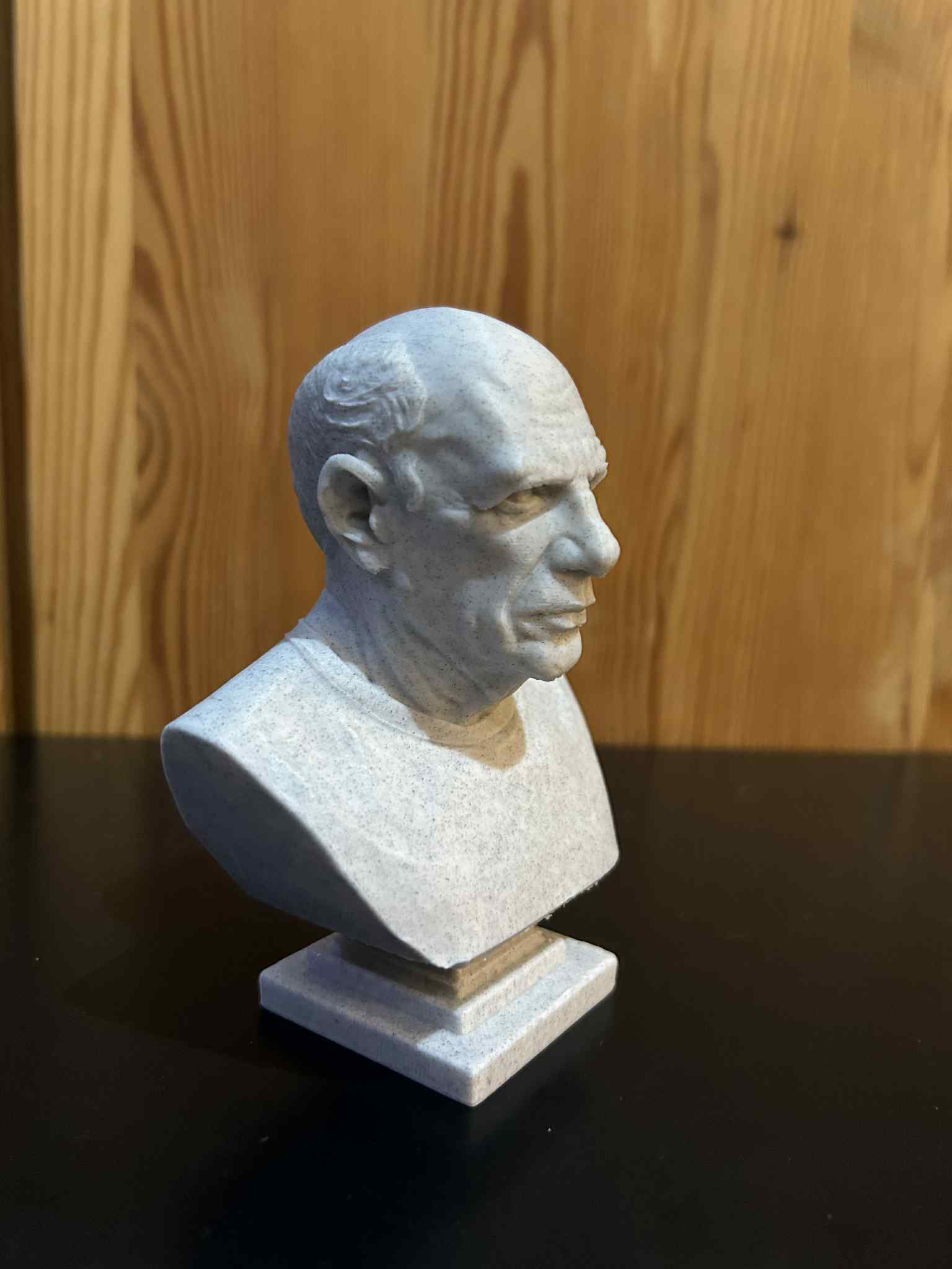 Mẫu bust in 3D khắc họa Pablo Ruiz Picasso với đầu hói, khối mặt mạnh và ánh nhìn sâu. Phong cách cổ điển, mảng khối rõ, giữ bất đối xứng tự nhiên để chân dung chân thật và giàu cá tính.