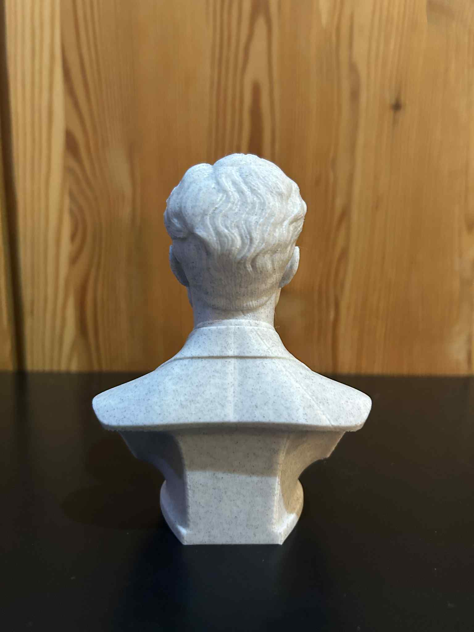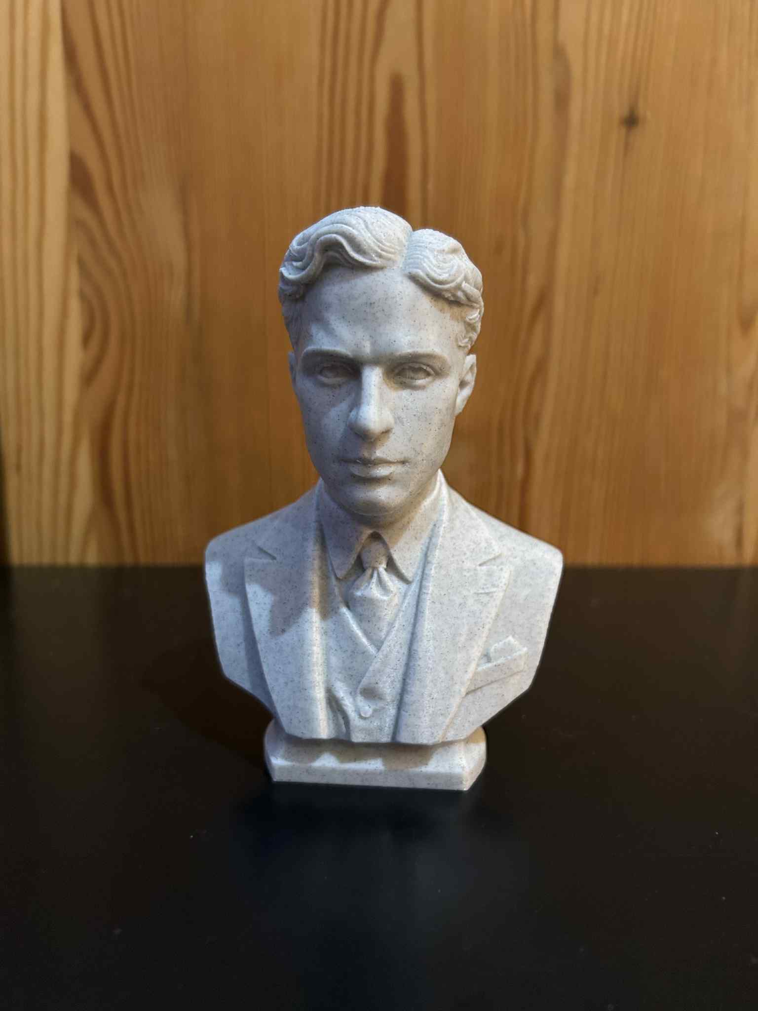 Mẫu chỉ tập trung vào phần đầu và nửa trên cơ thể, theo truyền thống bust cổ điển. Những nét đặc trưng của Chaplin—ánh mắt biểu cảm, bộ ria mép biểu tượng và cấu trúc gương mặt dễ nhận ra ngay—được nhấn mạnh cẩn thận. Hình khối được đơn giản hóa có chủ đích, đường nét được gia cường để tăng độ rõ của điêu khắc và đảm bảo phù hợp cho in 3D.