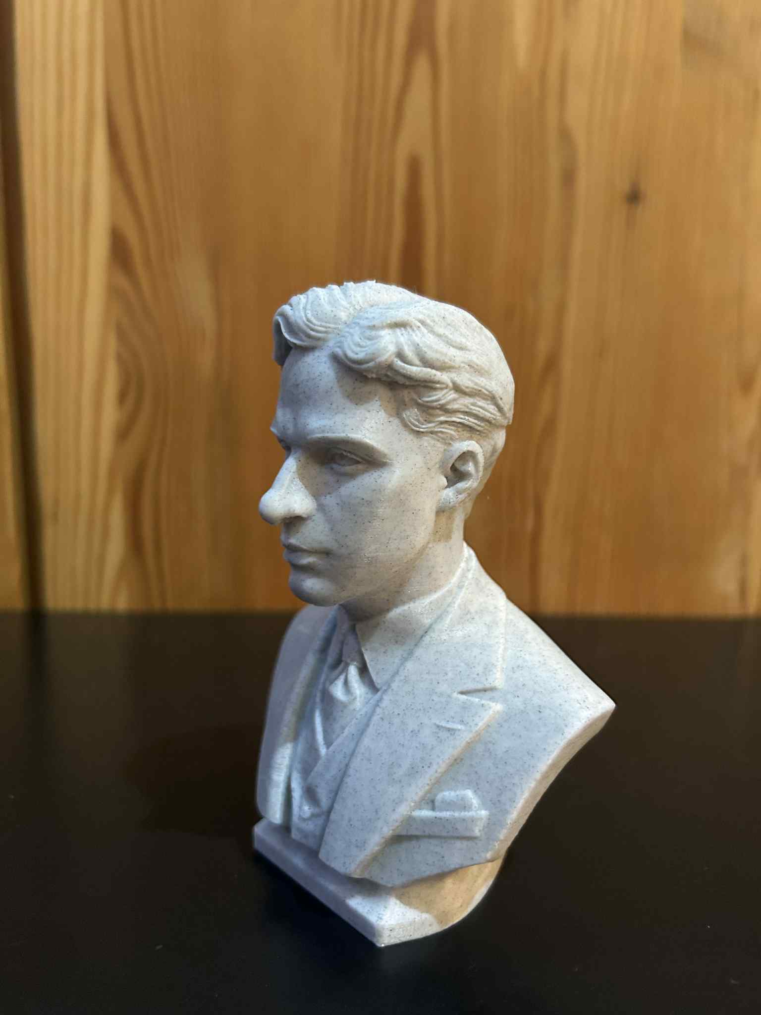 Mẫu tượng bán thân Charlie Spencer Chaplin tập trung vào phần đầu và nửa thân trên, nhấn mạnh ánh nhìn, bộ ria mép biểu tượng và đường nét gương mặt đặc trưng. Hình khối được tối giản để in 3D ổn định, mang chất điêu khắc cổ điển.