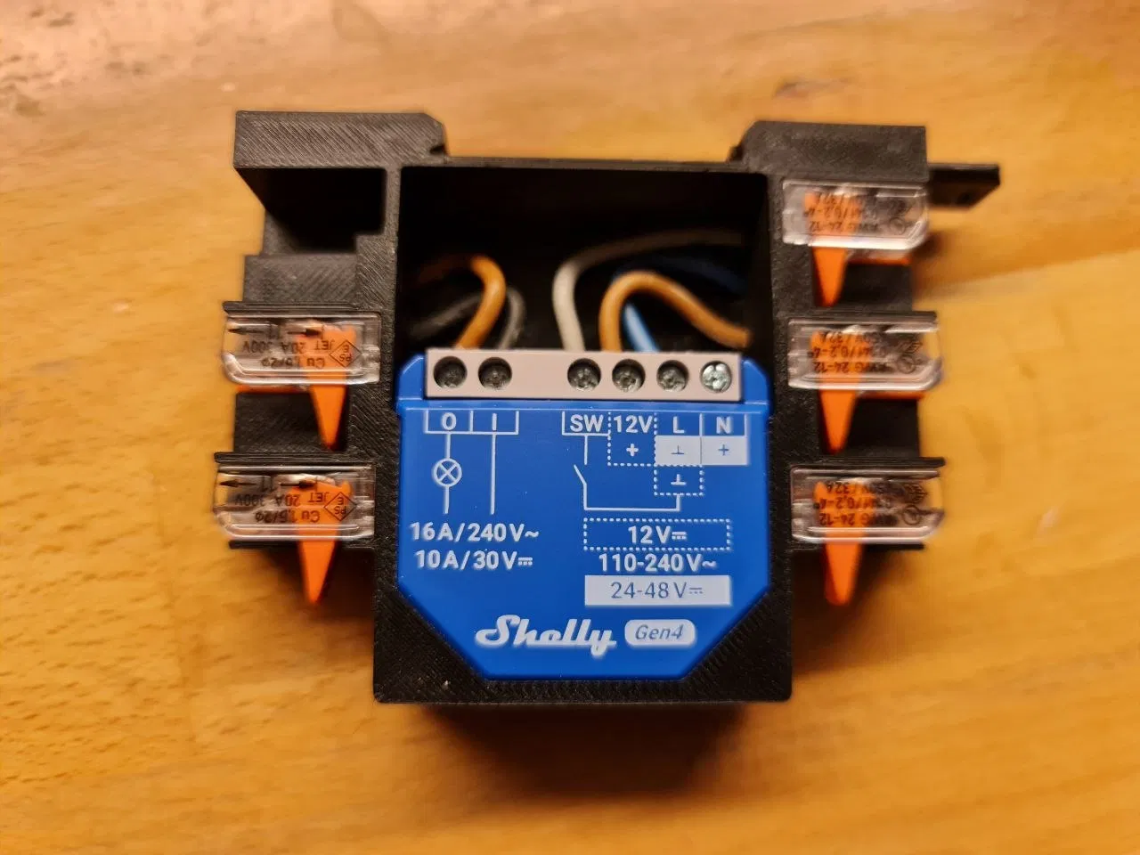 Mẫu này được thiết kế để giữ 1 Shelly thế hệ 4 (một số Shelly gen3 có thể cũng vừa). Shelly được giữ cố định và sẽ không bao giờ rơi ra. Chỉ cần đặt vào rồi trượt về phía trước (trong hình của mình là trượt xuống). Sau khi đi dây xong thì nó không thể trượt ngược lại nữa. Các kẹp WAGO 221 được giữ bằng cơ chế “click”. Bạn có thể tháo chúng an toàn bằng một cây tua vít nhỏ từ phía đáy của từng kẹp.