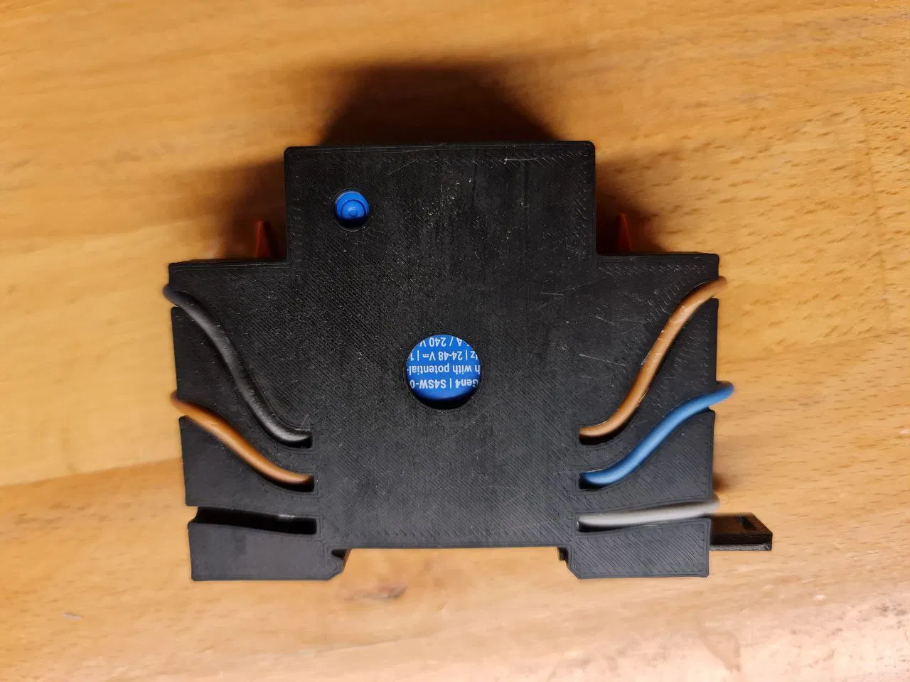 Lúc đầu mình làm kênh đi dây dạng kín hoàn toàn, nhưng không đủ chỗ trong một DIN rail mount tiêu chuẩn, vốn chỉ rộng 17,8mm. Mình gợi ý dùng dây dài khoảng ~8cm (tiết diện 1,5mm² – dây cứng (rigid) dùng rất ổn, nhưng dây mềm (flexible) cũng được). Một đầu dây có thể nối vào phía bên phải của kẹp WAGO 221. Sau đó bấm kẹp vào đúng vị trí. Luồn dây qua rãnh và qua lỗ. Cắt đúng chiều dài rồi nối vào Shelly.