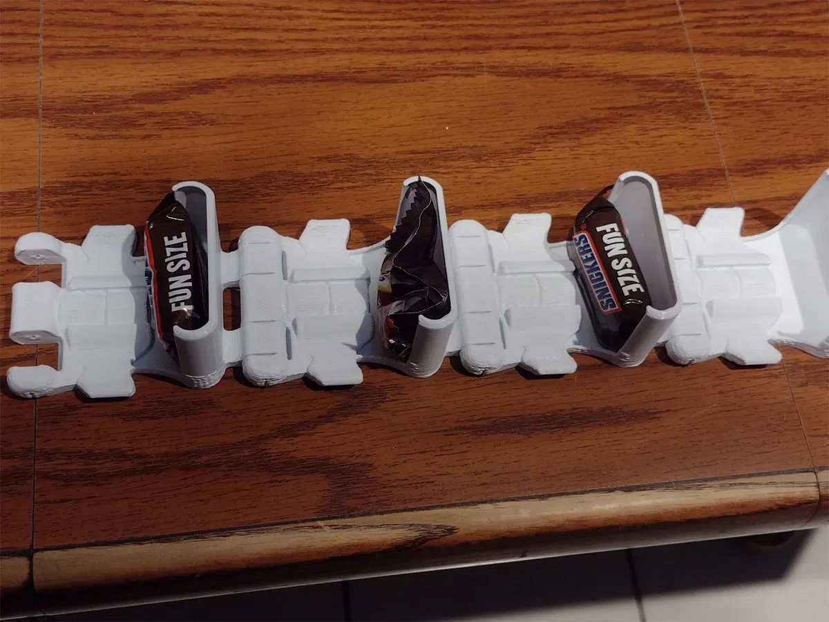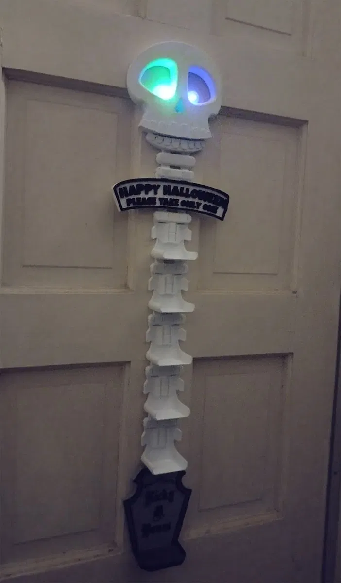 Đây chỉ là một công việc đang tiến triển vì tôi chưa in đầy đủ nó, nhưng tôi đã in mọi thứ cần phải khớp với nhau và tất cả đều hoạt động nên tôi tin rằng nó sẽ ổn. Tôi muốn nhận được bài này đúng lúc cho Halloween vì vậy đây là. Đó là một "thang kẹo" mà tôi dự định gắn trên cửa của họ bằng các dải chỉ huy. Nó sẽ để cho những kẻ lừa bịp lấy kẹo của họ (với một dấu hiệu yêu cầu họ chỉ lấy một LOL). Các khe cho kẹo sẽ được nạp lại giữa khi không ai ở cửa. Chúng ta sẽ thấy việc yêu cầu bọn trẻ chỉ làm một tác phẩm tốt như thế nào, nhưng tôi nghĩ chúng nên có đủ kẹo trong tay ngay cả khi chúng thỉnh thoảng được làm sạch bởi một ông Stealy.
