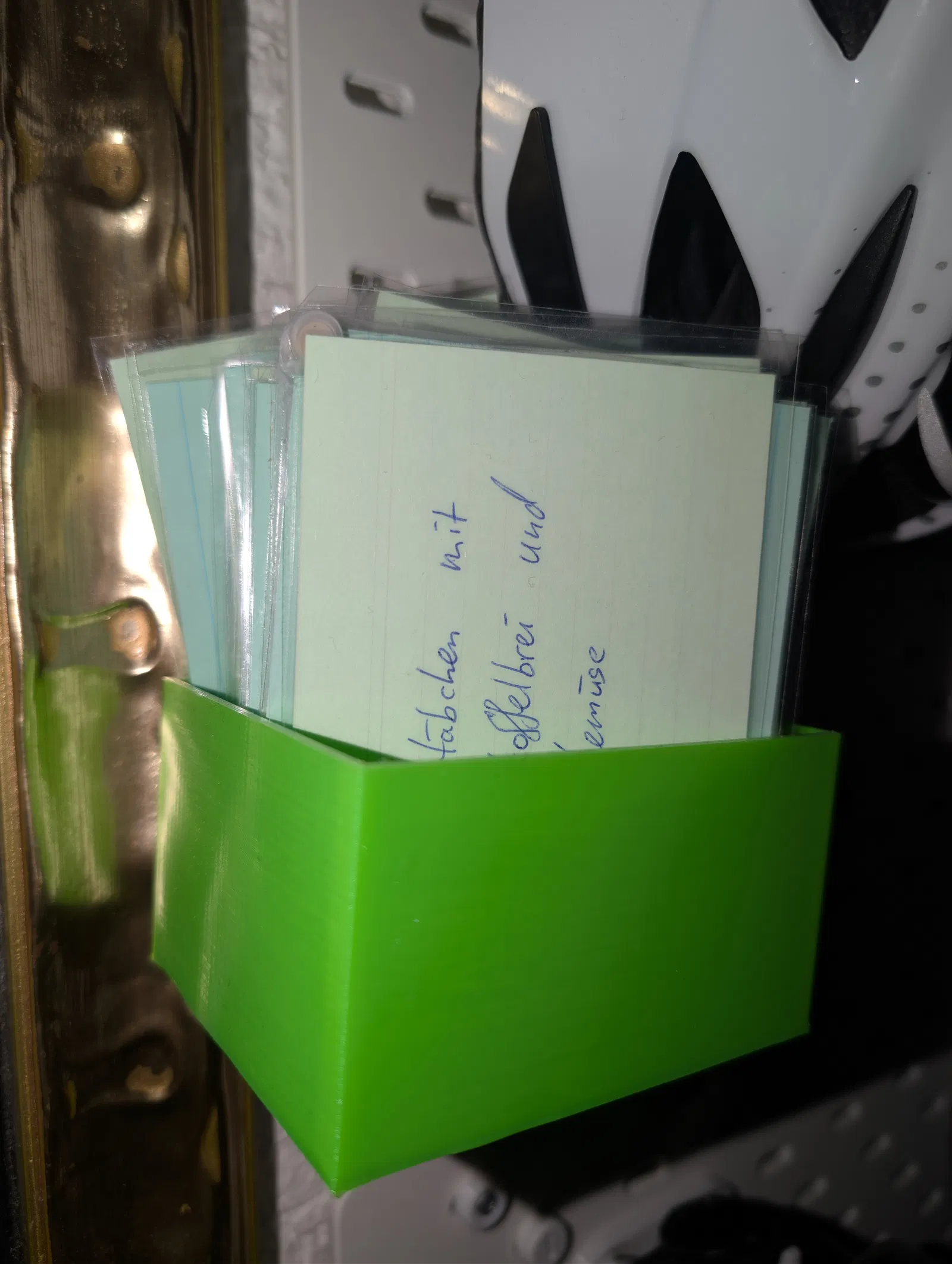 Bản remix hộp đựng index card/flashcard tương thích IKEA Skadis, có móc gắn sẵn nên bám chắc, không lắc và dễ dời chỗ. In PLA khuyến nghị, 3 walls, infill 15–20%, cần supports cho phần móc.
