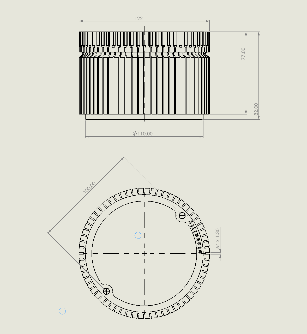 Cylinder cho máy đan vớ tròn (CSM) Gloria 64 với 64 kim. Kích thước: Ø122mm, cao 82mm, khoảng cách lỗ bắt 100mm. Có 2 hốc gắn ê-cu lục giác M5; gợi ý in PLA 5 wall loops, infill 30%.