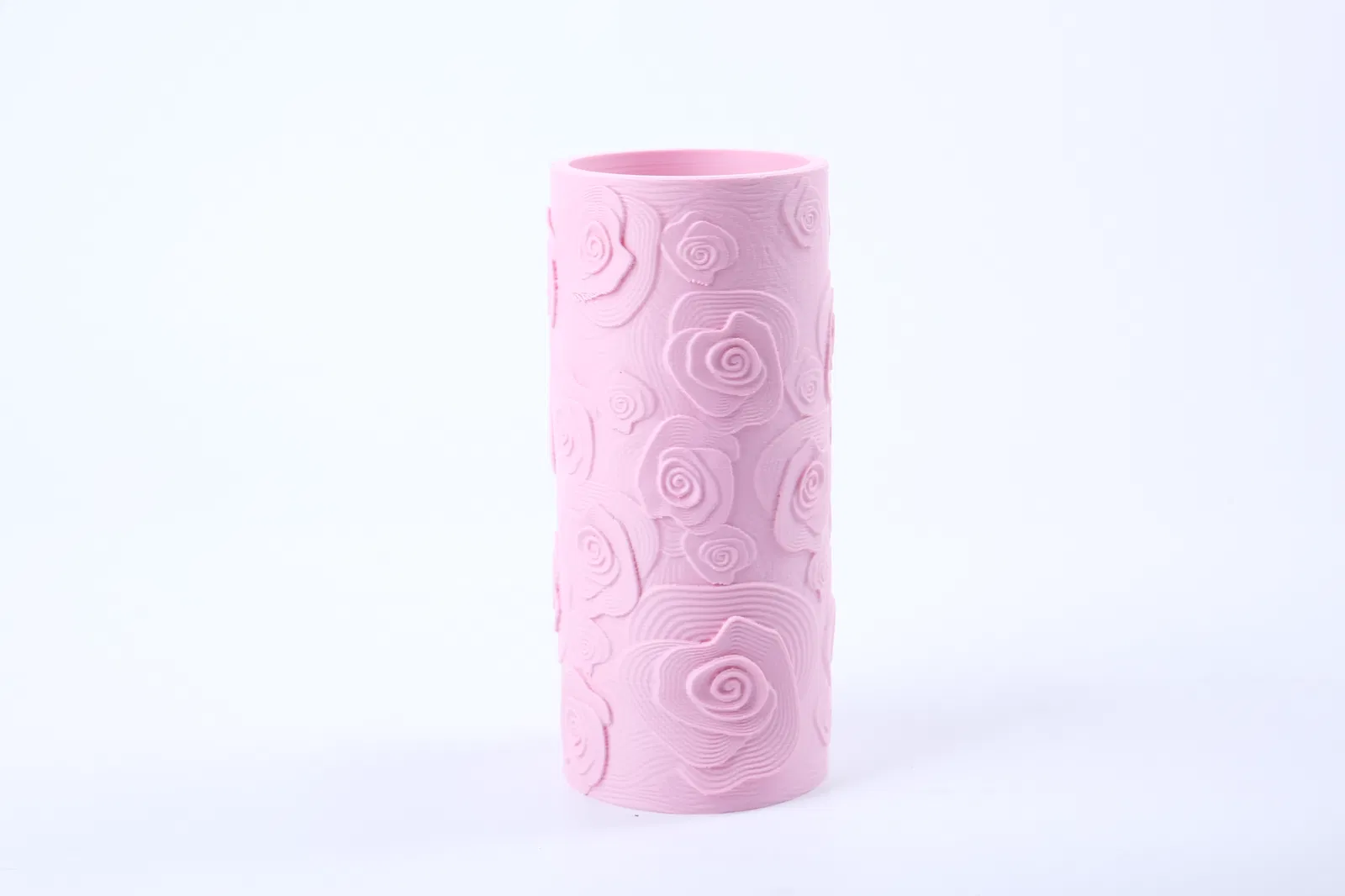 Bình hoa cao trang trí với tông hồng pastel dịu, phủ toàn bộ bề mặt bằng họa tiết rose relief (hoa hồng nổi). Mẫu bình mang tính điêu khắc này được thiết kế như một điểm nhấn nội thất nhẹ nhàng, kết hợp form tối giản hiện đại với bề mặt hoa văn floral tinh tế. Họa tiết hoa hồng lặp lại ôm theo dáng trụ một cách tự nhiên, tạo chiều sâu, nhịp điệu và cảm giác thị giác “có thể chạm” mà không làm rối tổng thể.