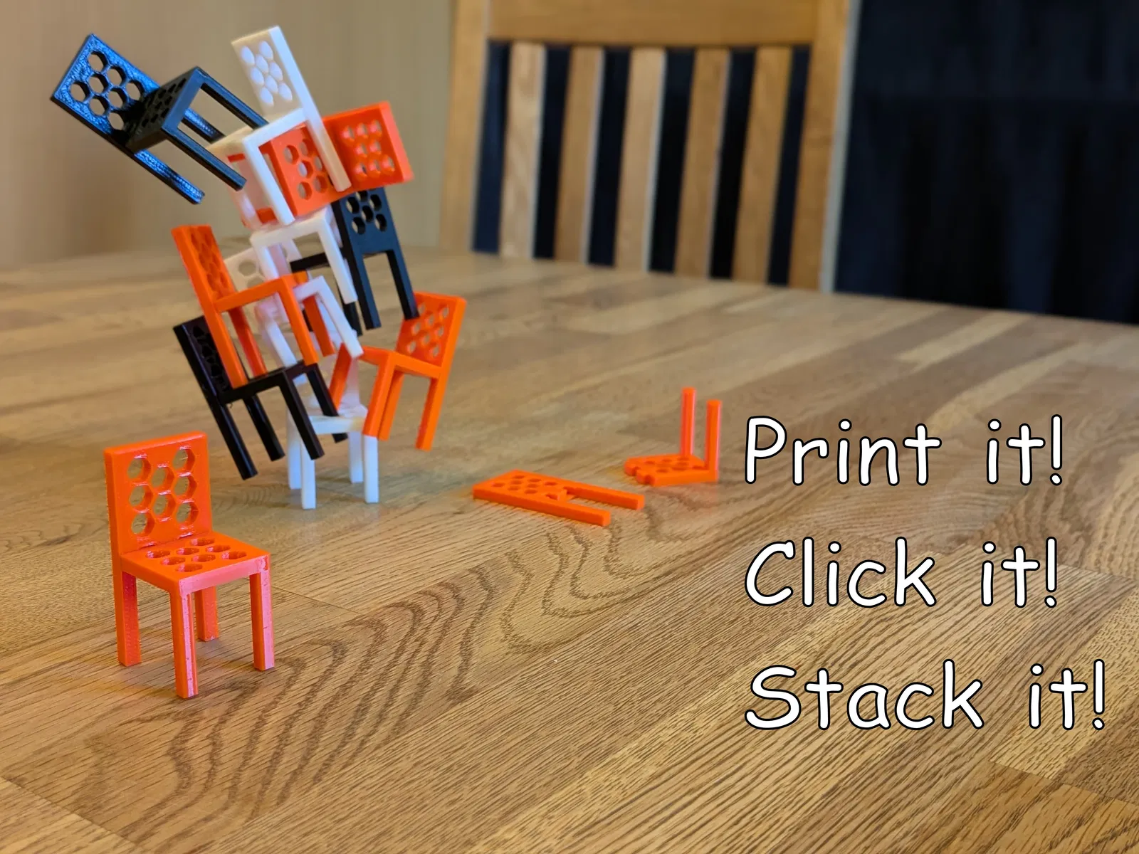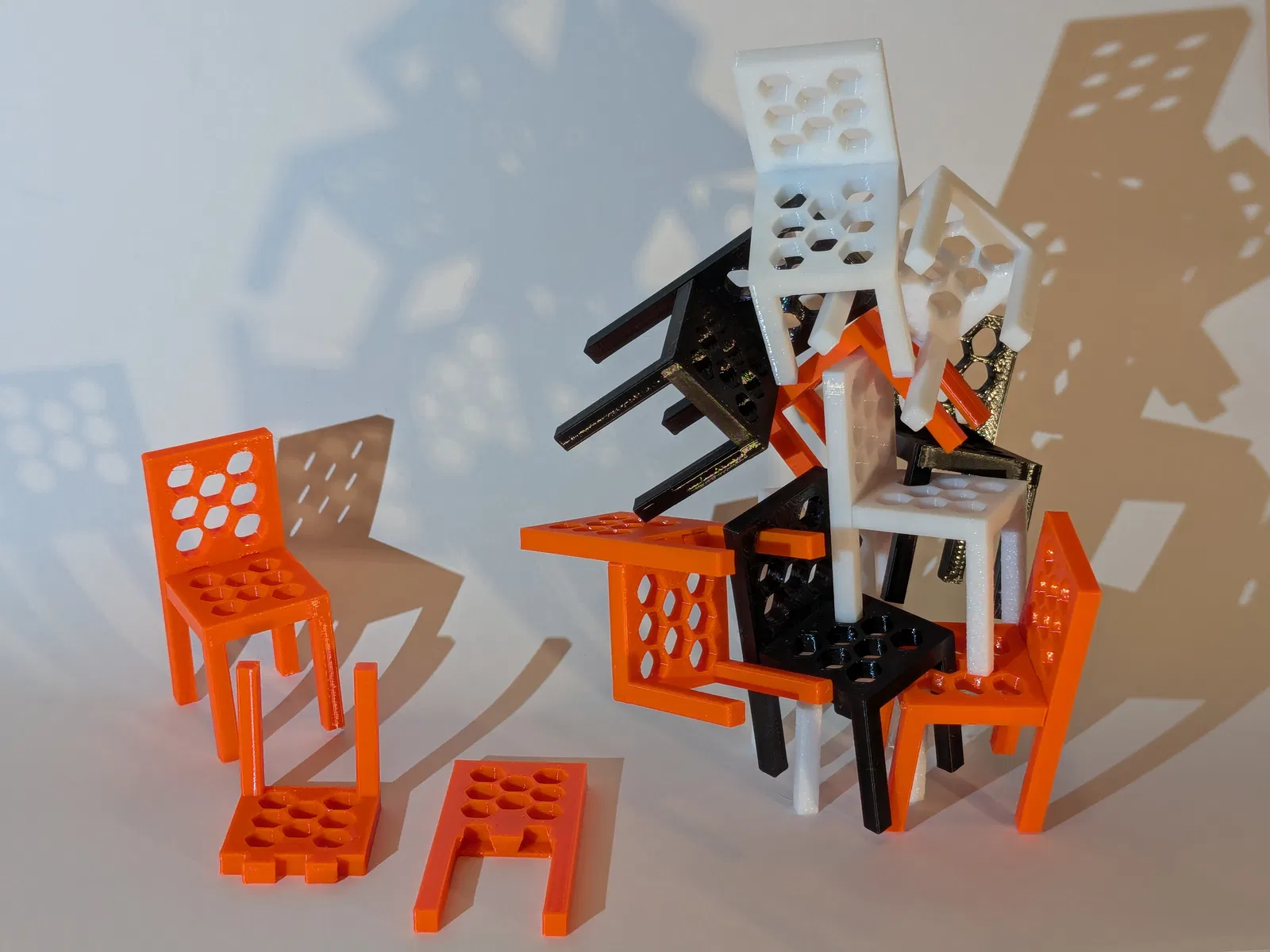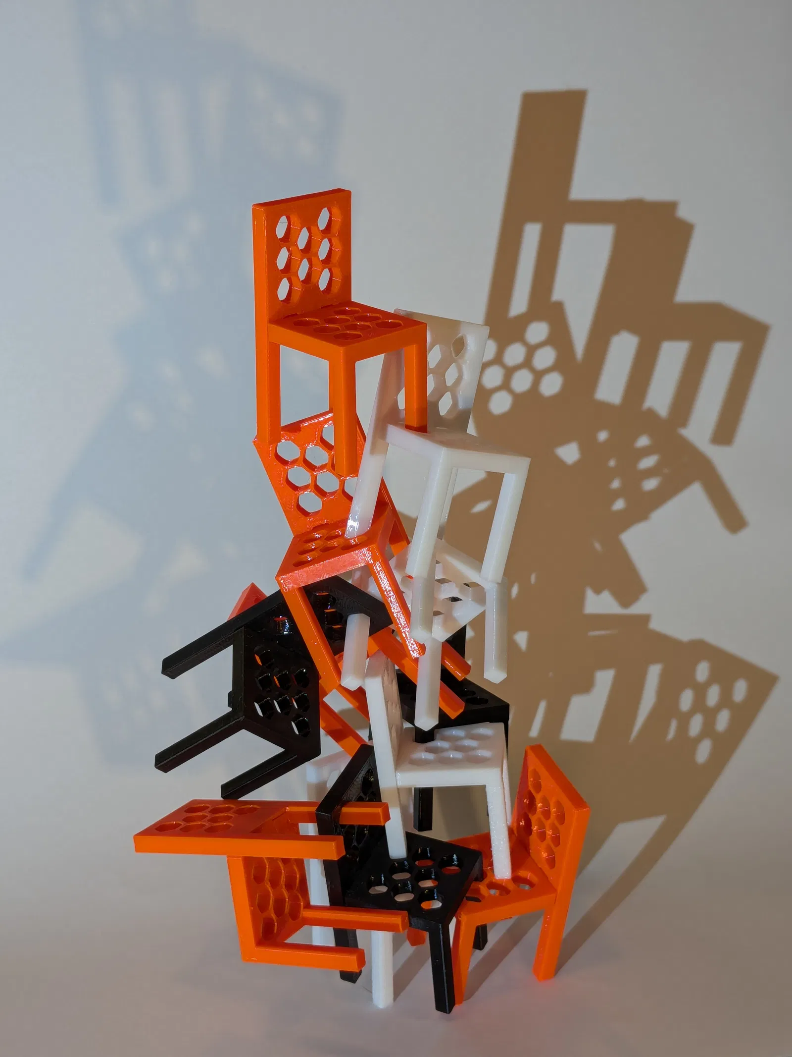 Bộ ghế cho trò chơi xếp chồng, in không cần supports hay bridges. Mỗi ghế gồm 2 phần bấm khớp (snap) vào nhau, kết cấu honeycomb cho nhiều kiểu xếp. In PETG hoặc PLA đều ổn với profile 0.2 mm balanced.