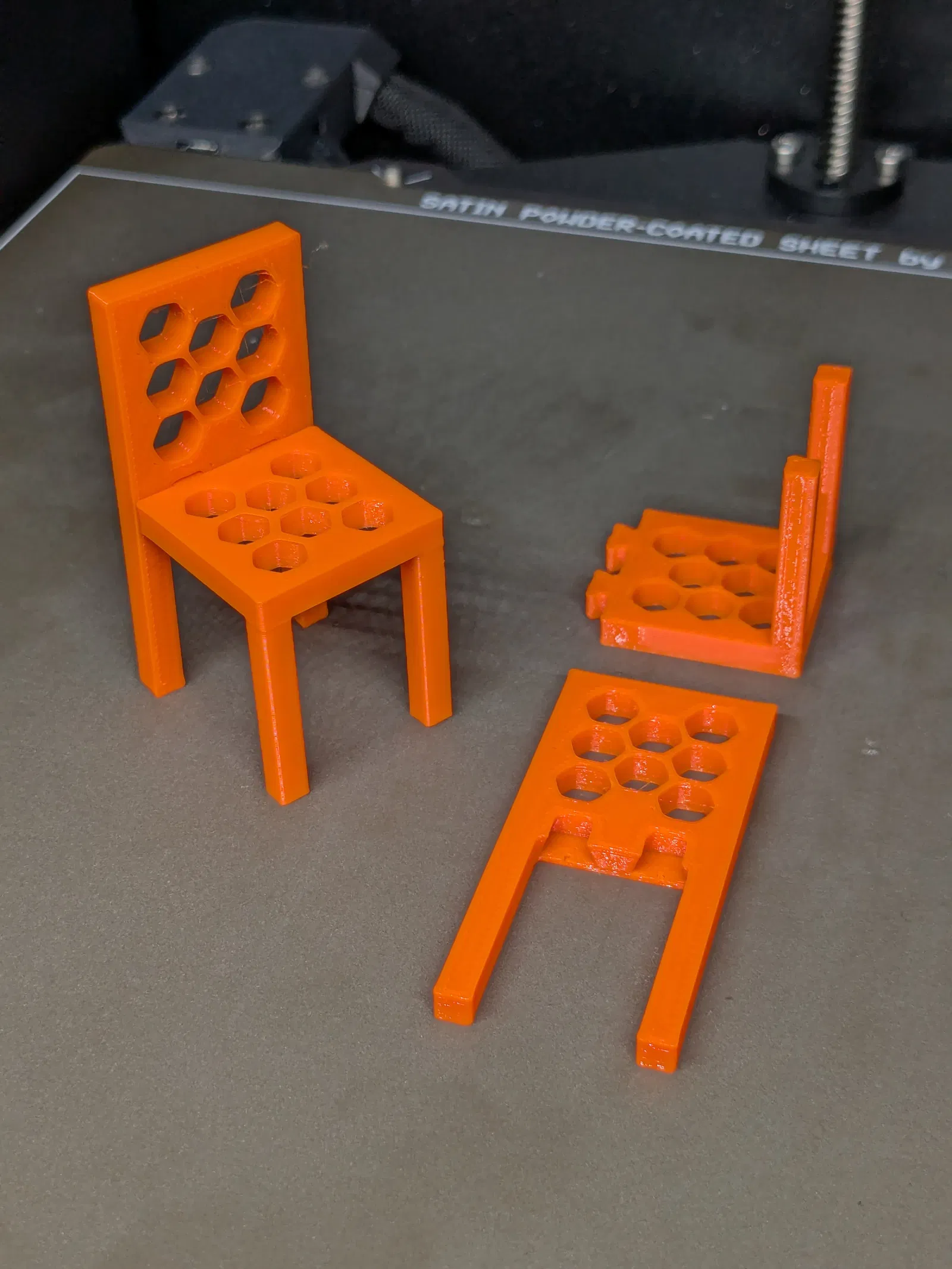 Mình thiết kế một phiên bản trò chơi này để in dễ dàng, không cần supports hay bridges. Lắp ráp cũng vui tay và cảm giác “đã”. Kết cấu honeycomb cho phép tạo ra rất nhiều kiểu sắp xếp khác nhau chỉ với một thiết kế ghế.