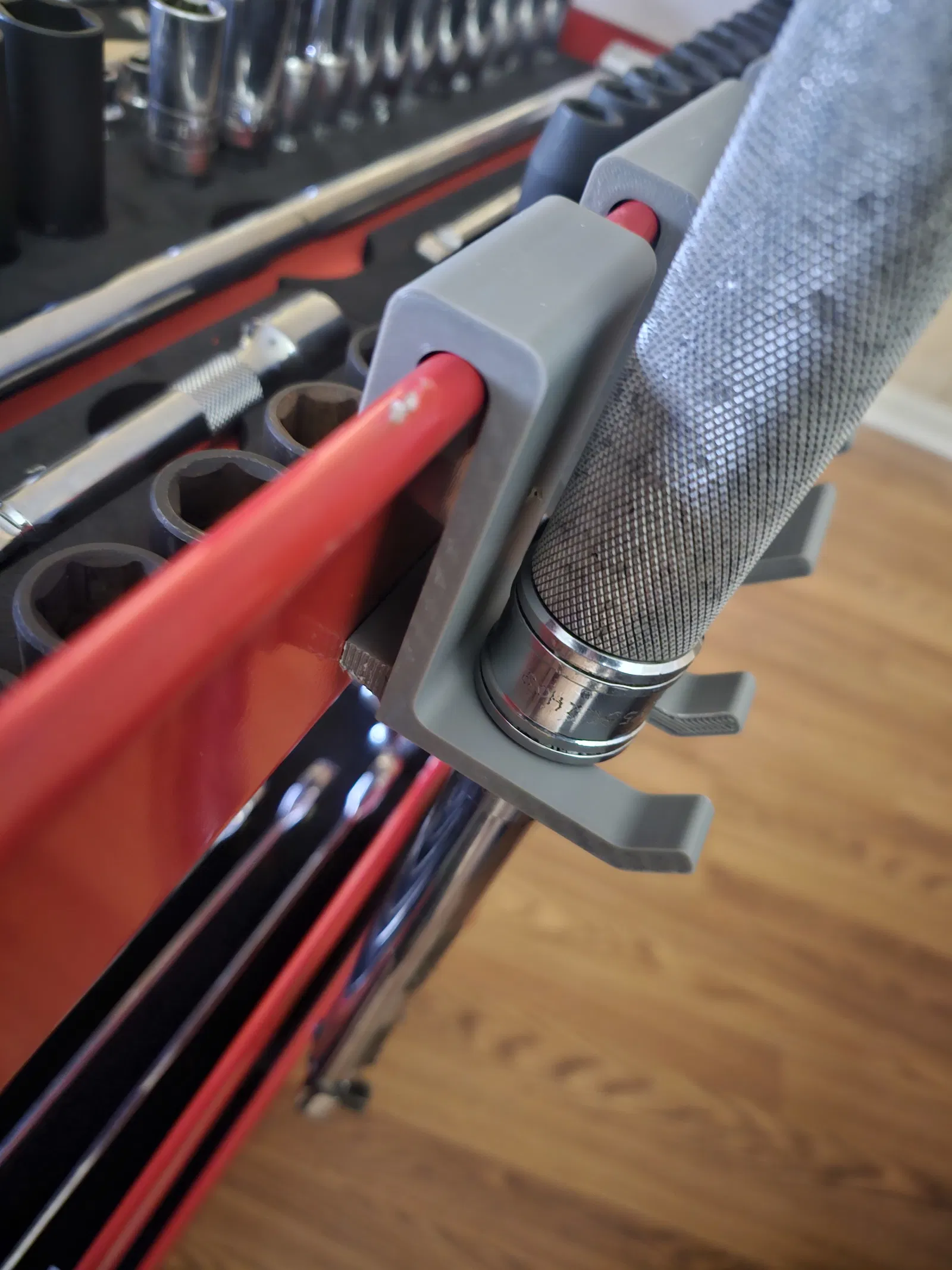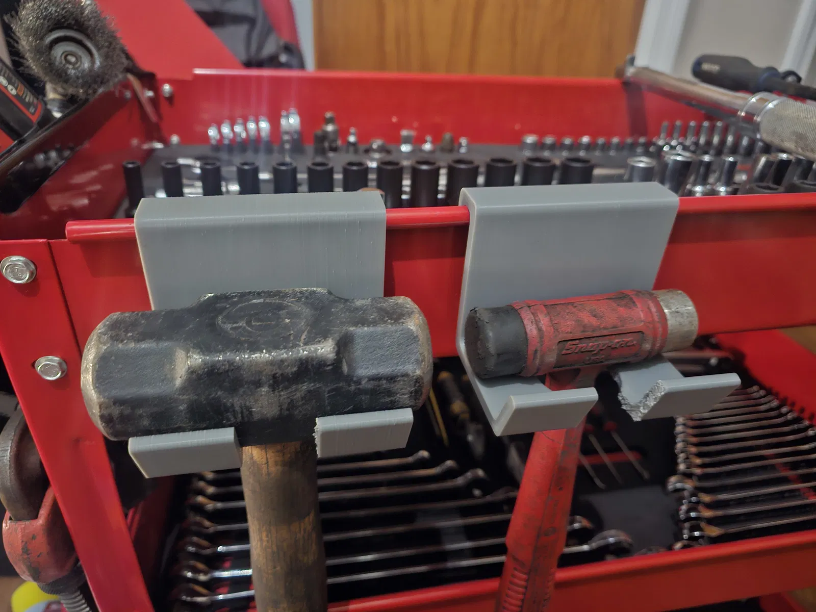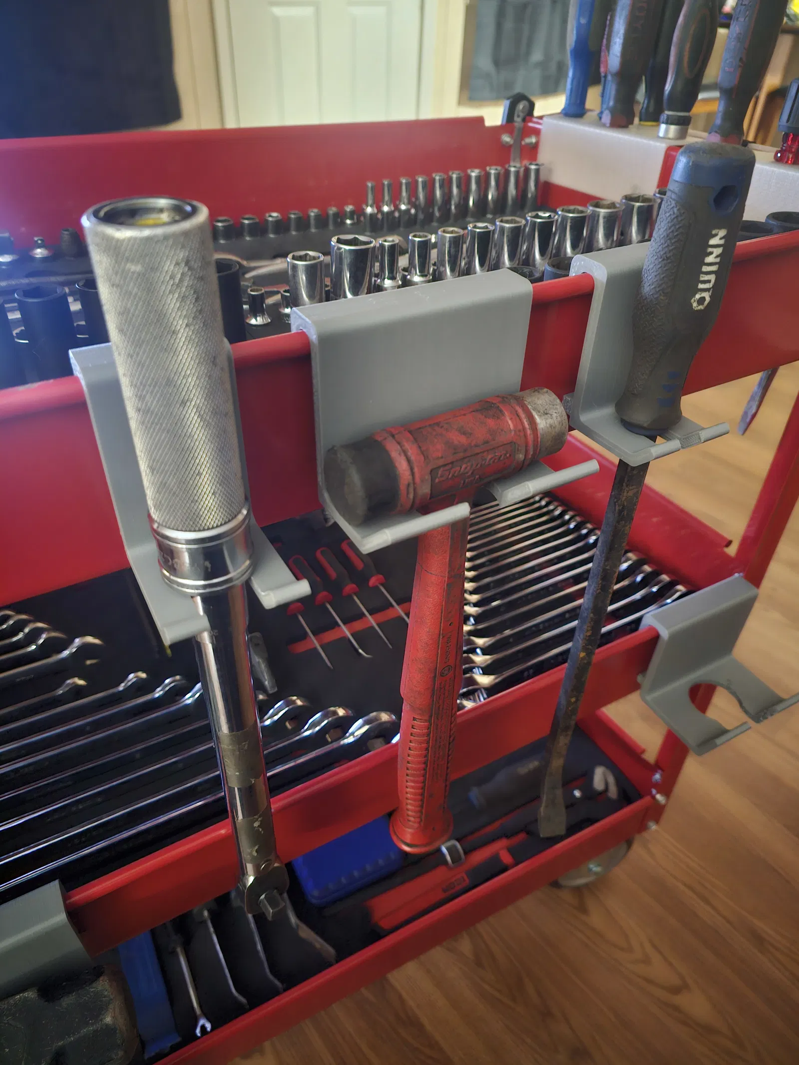 Bộ file STL móc treo dụng cụ gắn hông xe đẩy Harbor Freight 3 tầng (U.S. GENERAL SKU:62179). Gồm 2 base 100mm/50mm để remix và các mẫu cho búa Snap-on, Torque Wrench và pry bar 36".