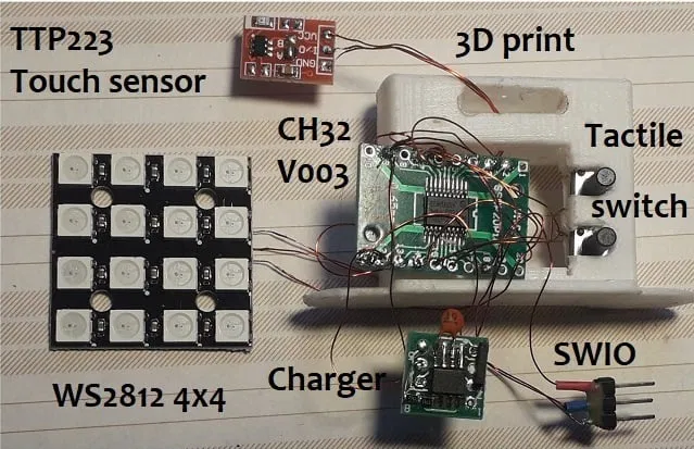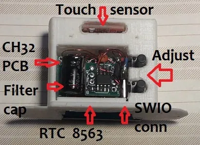 Lắp ráp: In các chi tiết 3D. Dùng dây đồng tráng men 0.25mm để đi dây. Trong vỏ, thứ tự là WS matrix, rồi tới board CH32 và board đồng hồ. Có một hốc để đặt TTP223 và nút nhấn tactile 6x6mm. Xem hình.