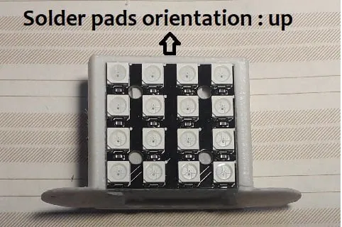 Display: Ma trận 16 LED WS2812B mắc nối tiếp có bán trên Aliexpress. Nối 3 dây: Gnd, Vcc, DI (data). Tụ 470uF giúp làm phẳng các đỉnh dòng. Đặt tấm display sao cho pad hàn hướng lên trên.