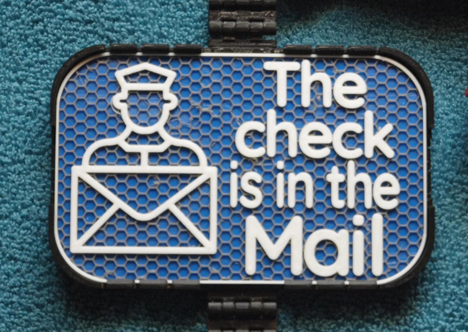 Bảng 100x160mm với chữ “The check is in the Mail”, kèm hình bưu tá và phong bì. Có model Mesh & Solid, khuyến nghị color switch trên 1mm (có gcode kèm). Dùng vừa Shadowbox Frames.