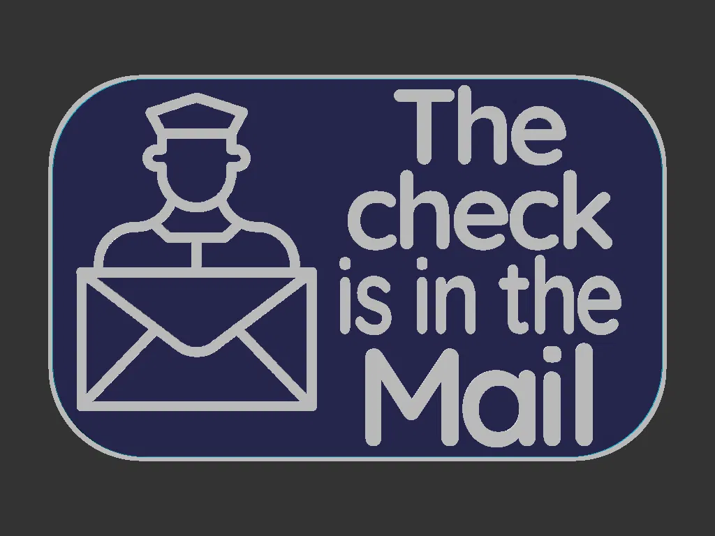 Bảng kích thước 100x160mm, với dòng chữ "The check is in the Mail", kèm hình minh họa anh bưu tá và phong bì.