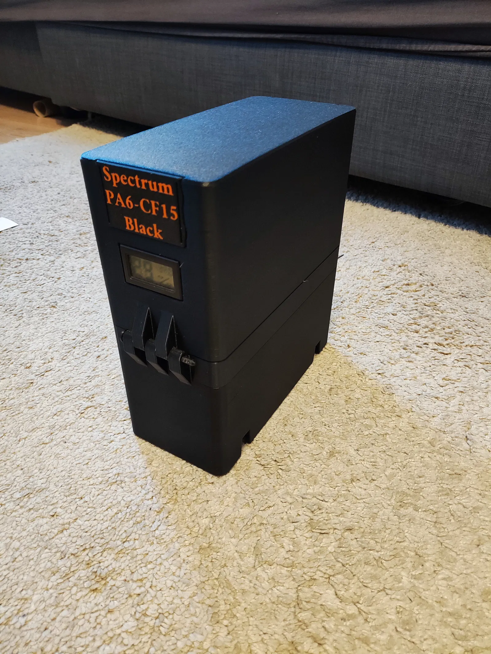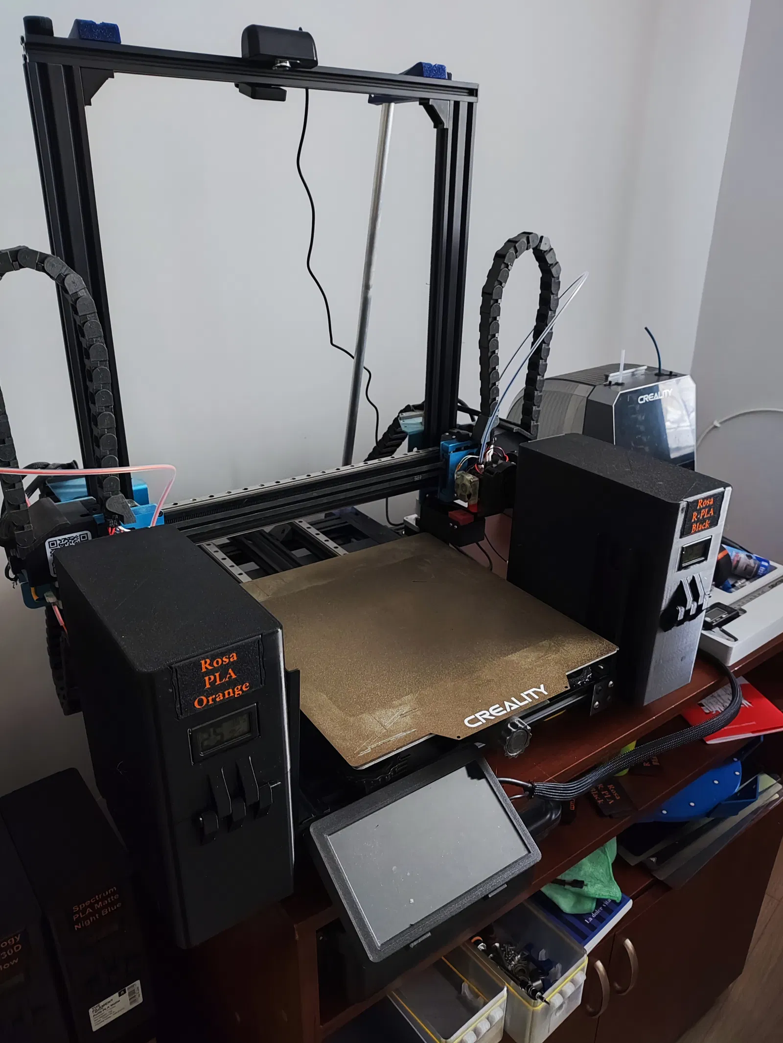 Drybox in 3D gần như toàn bộ, dùng gioăng TPU. Vừa spool 1kg đường kính trong 53 mm. In khoảng 750g filament; cần bạc đạn 606, hygrometer, bu lông M3, heatset inserts và đầu nối PTFE M10. Có điểm bắt cho 4040 extrusions.