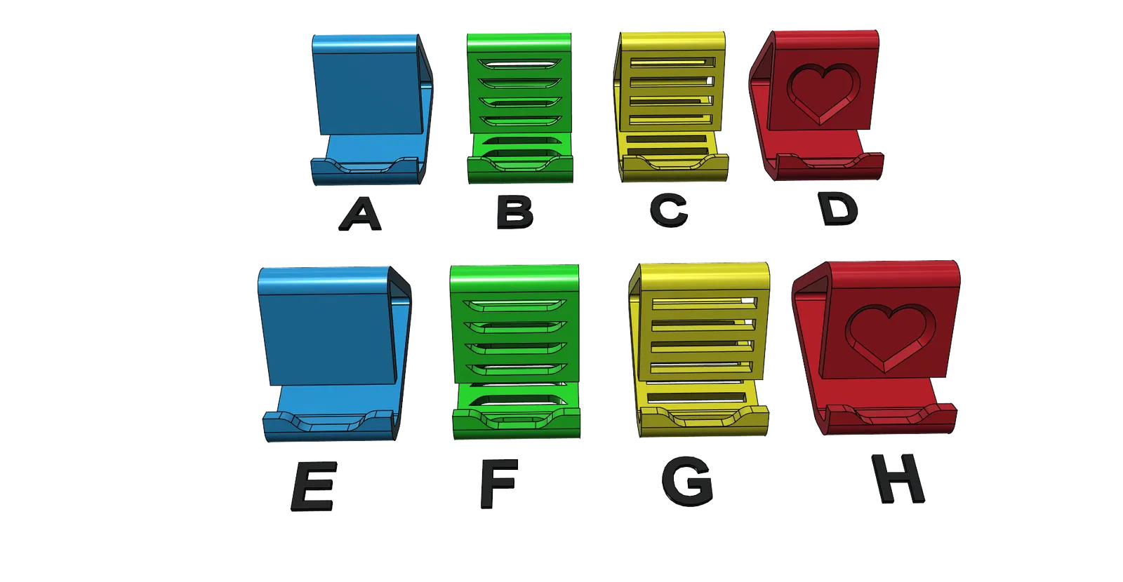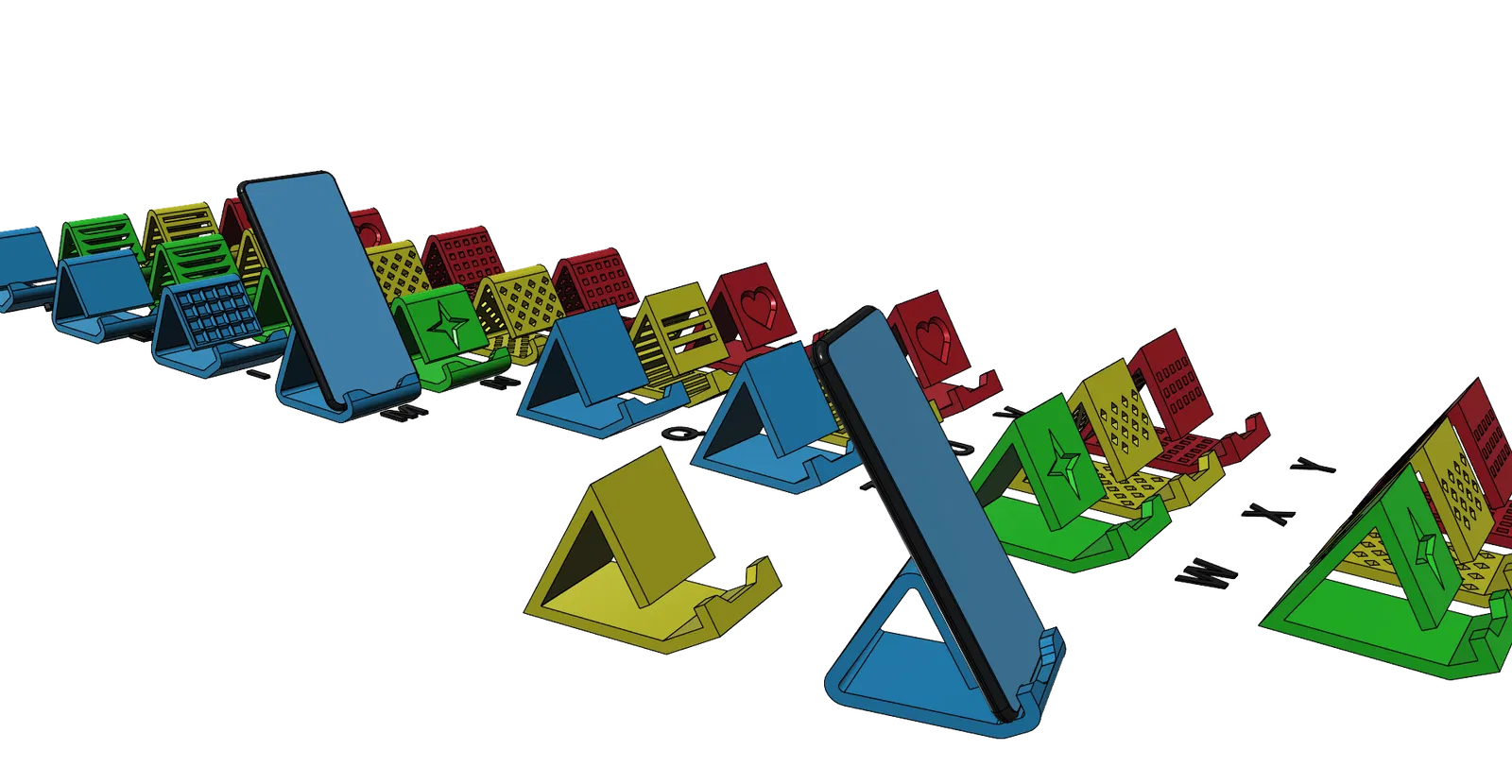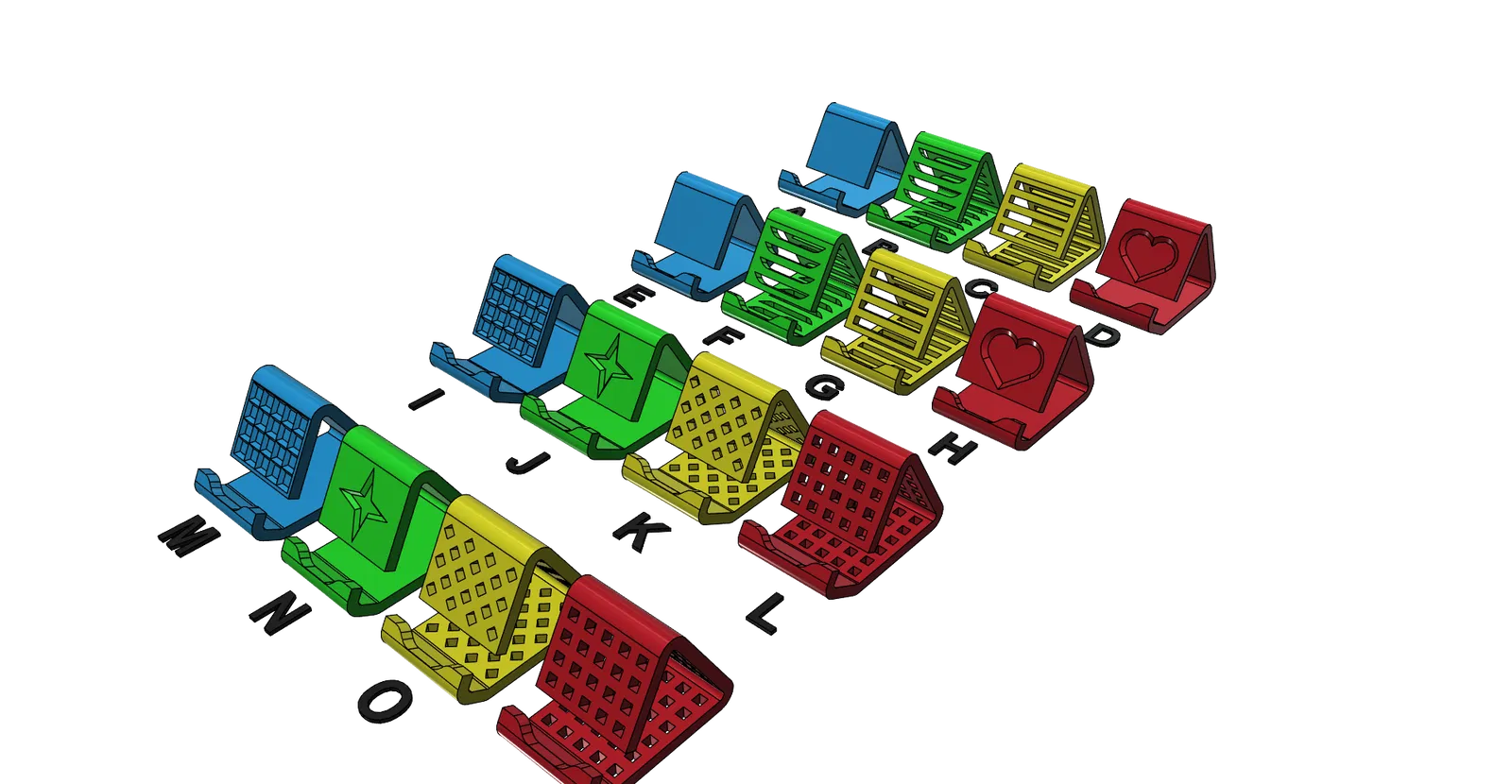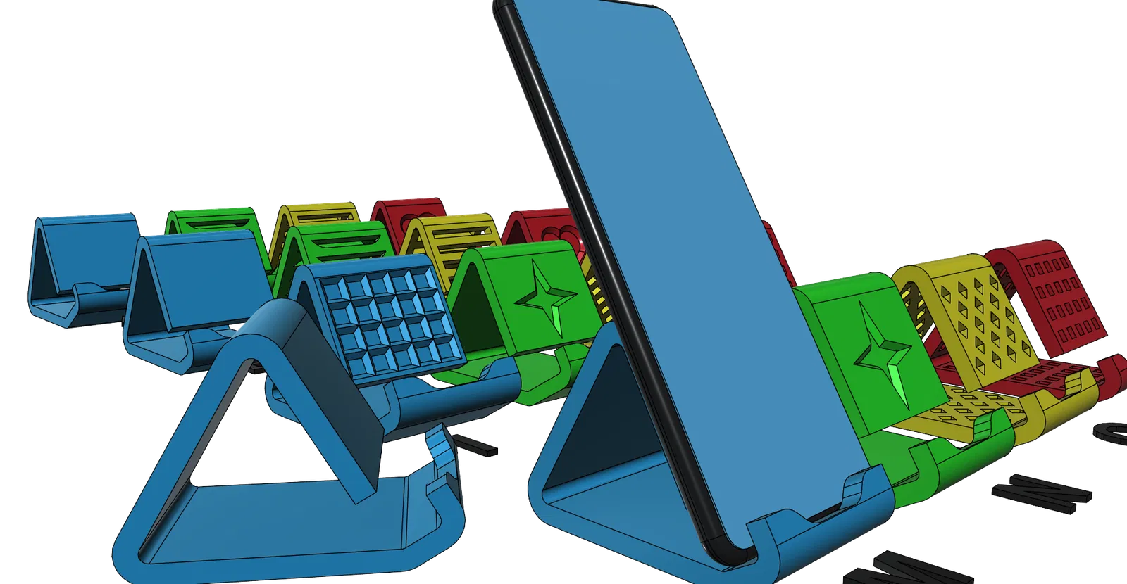Giá đỡ điện thoại universal gồm 28 phiên bản, in được không cần support. Tiết kiệm filament (~10m với 2 perimeters, 15% infill). Có bản cho máy có ốp (tối đa 21mm) và không ốp (tối đa 9.8mm), rất ổn định.