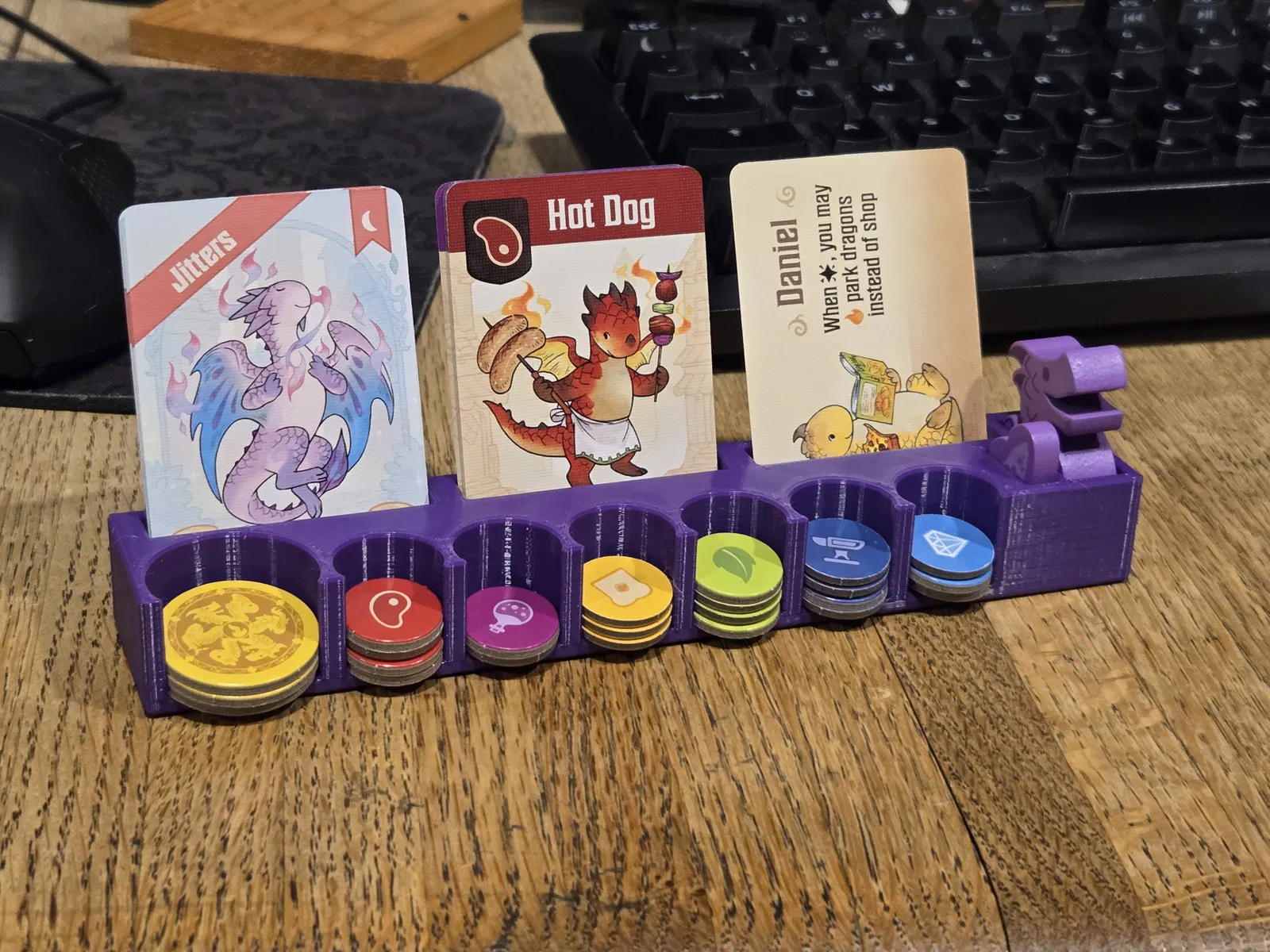 Đây là một bộ player resource organizer cho board game "Flamecraft". Nó giúp giữ tài nguyên và thẻ bài của người chơi gọn gàng trong một thiết kế nhỏ gọn, dễ sử dụng. Các khe để coin được làm nghiêng nên rất dễ bỏ vào, đếm và lấy ra chỉ với ngón cái và ngón trỏ. Ba khe để card có thể dùng cho fancy dragons, artisan dragons và một companion dragon.