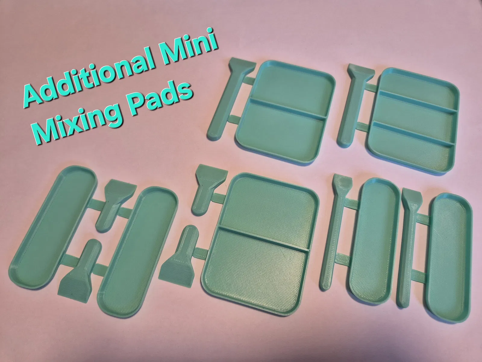 Bộ bổ sung các Mini Mixing Pads thay thế, gồm pad dạng tách ngăn và spatula đã chỉnh sửa. Tất cả phiên bản đều compatible kích thước với mẫu Disposable Mini Mixing Pad, có biến thể compact gọn hơn để đặt cạnh nhau.
