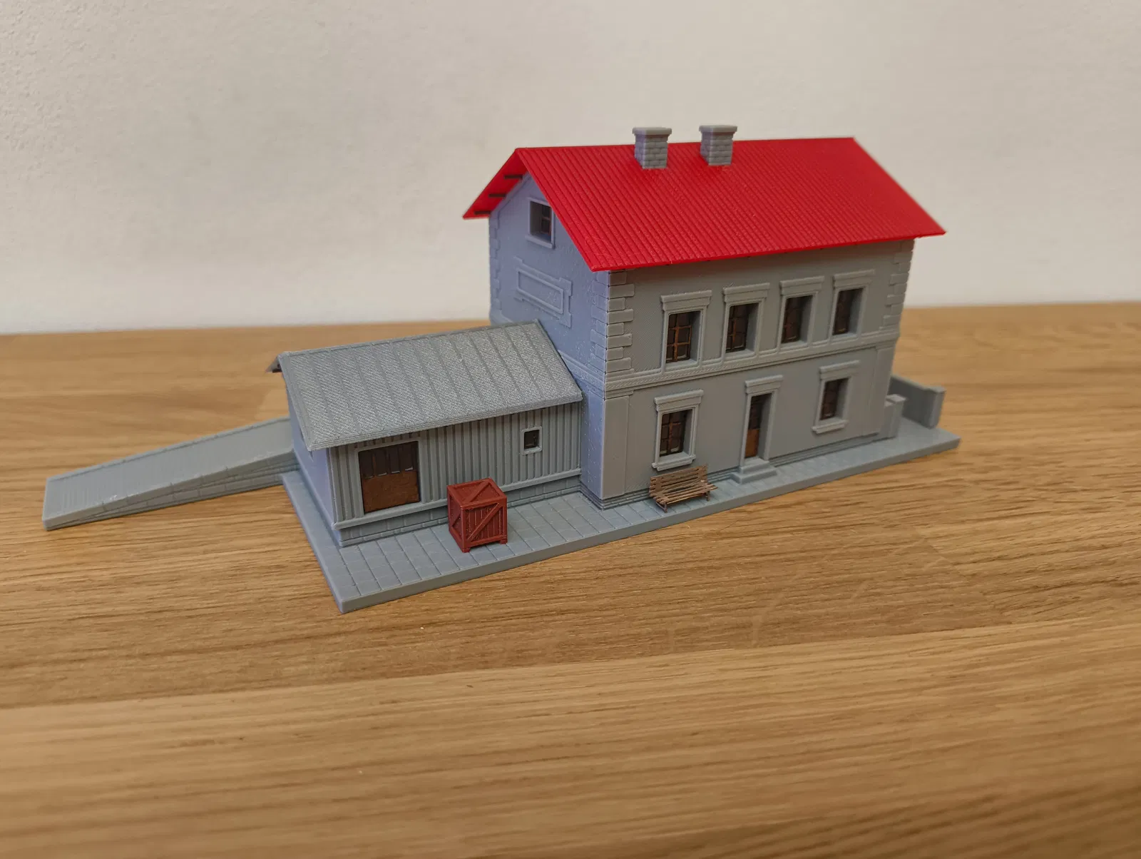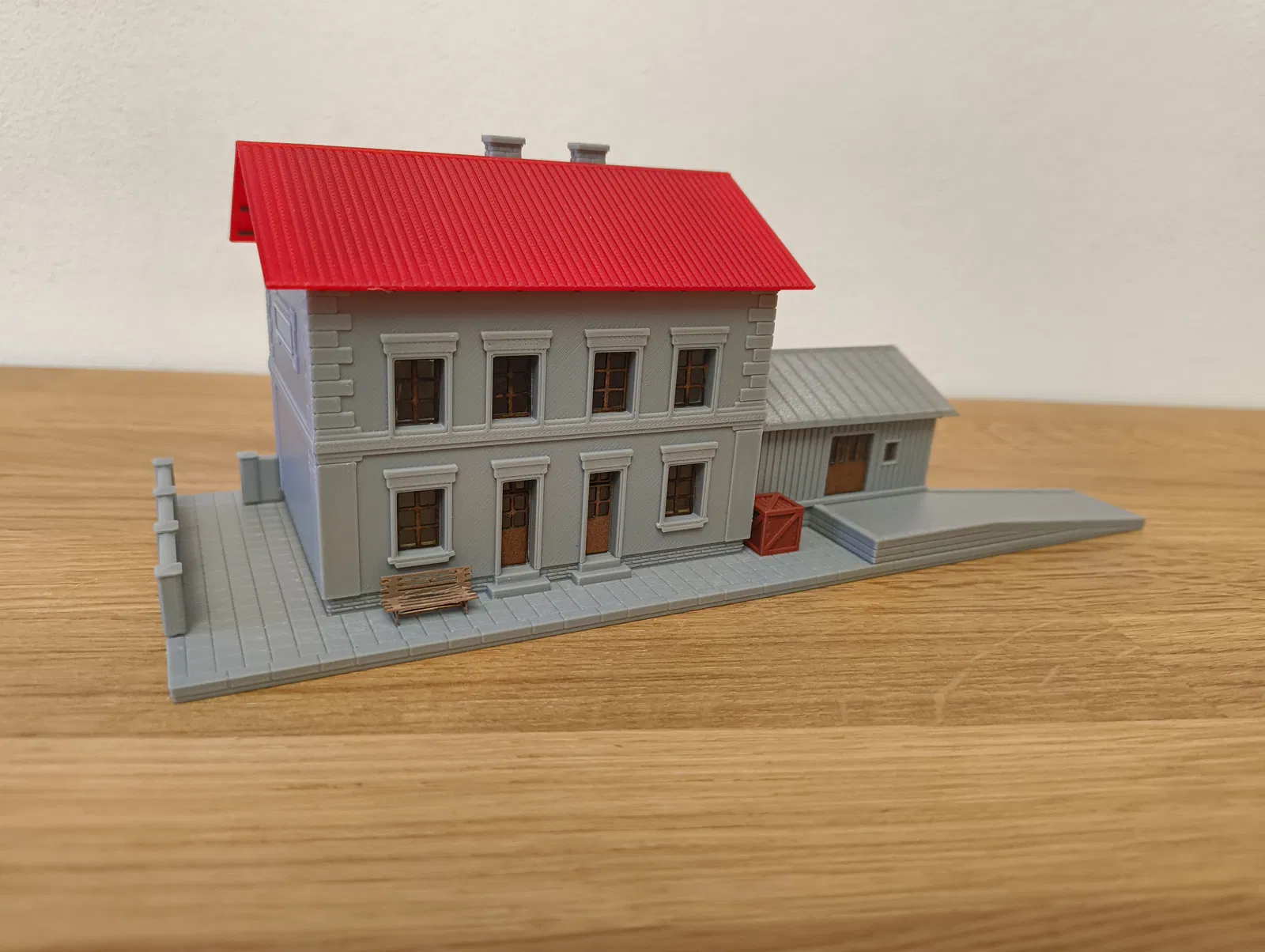 Mô hình tòa nhà nhà ga đường sắt kèm ramp bốc xếp, thiết kế cho layout/kolejiště tỷ lệ TT (1:120). Khung và phần kính cửa sổ cắt laser, có ngàm lắp đèn LED 5mm.