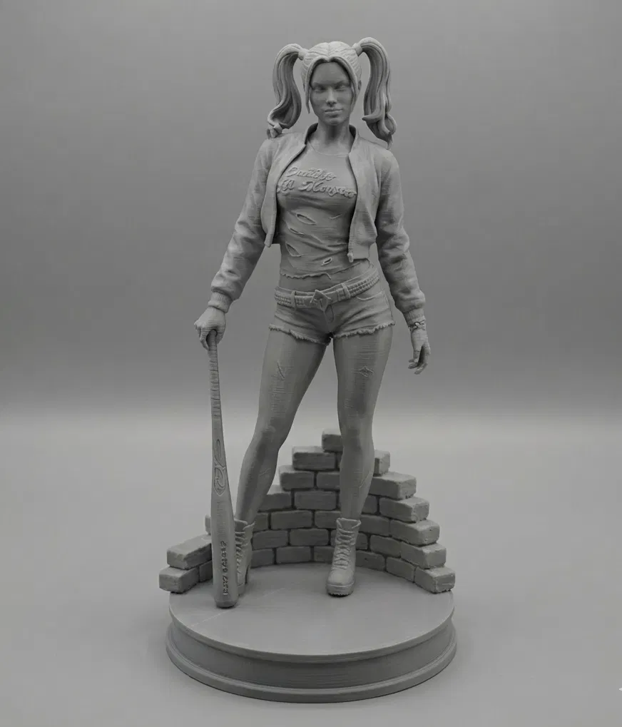 Mẫu figure Harley Quinn chi tiết trong pose biểu tượng, cầm gậy bóng chày và đế họa tiết gạch. Phù hợp in 3D để trưng bày bộ sưu tập fan DC, khuyến nghị layer 0.2 mm, supports Organic.
