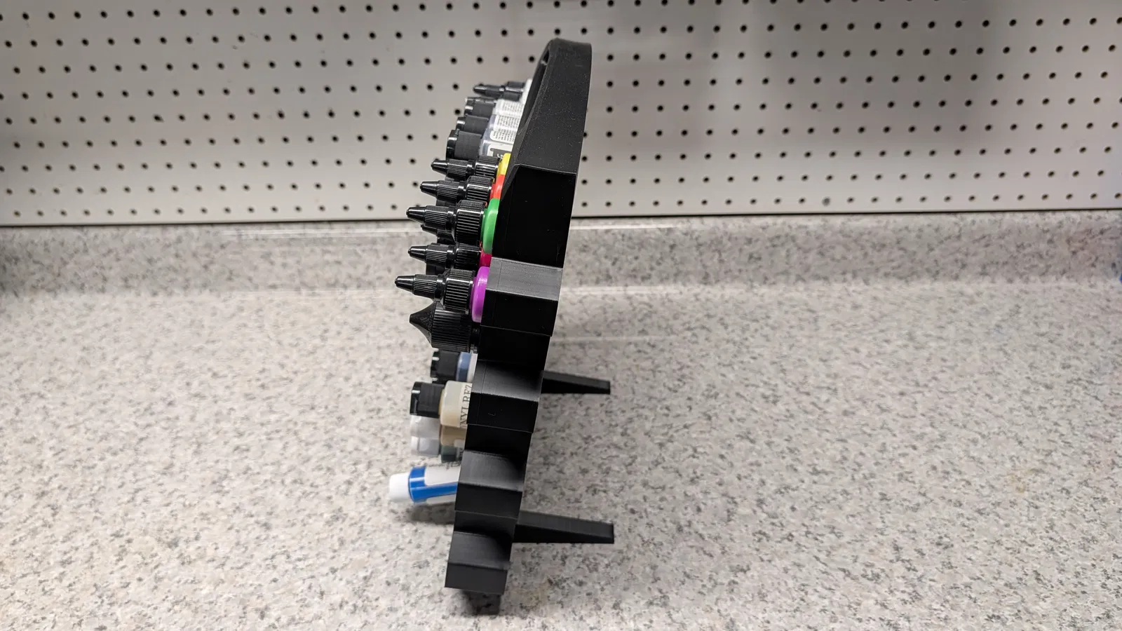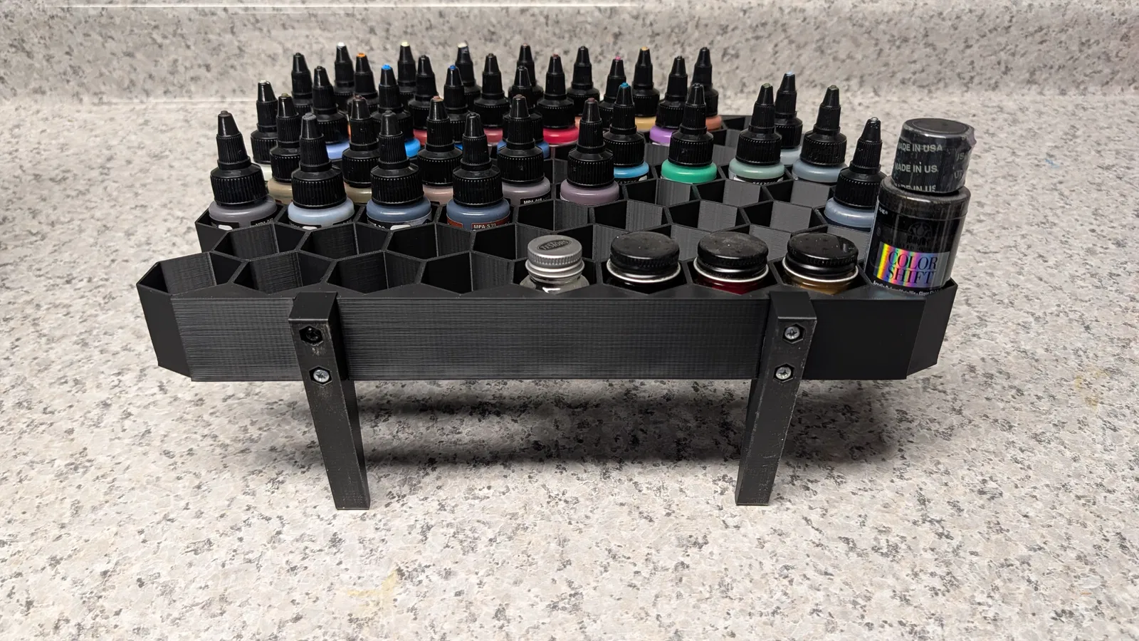 Kệ lưu trữ sơn dạng lục giác, chứa được nhiều kích cỡ lọ sơn khác nhau. Có tay xách tích hợp và chân gắn rời để tăng độ vững, tiện mang qua lại giữa kệ lưu trữ và bàn sơn.
