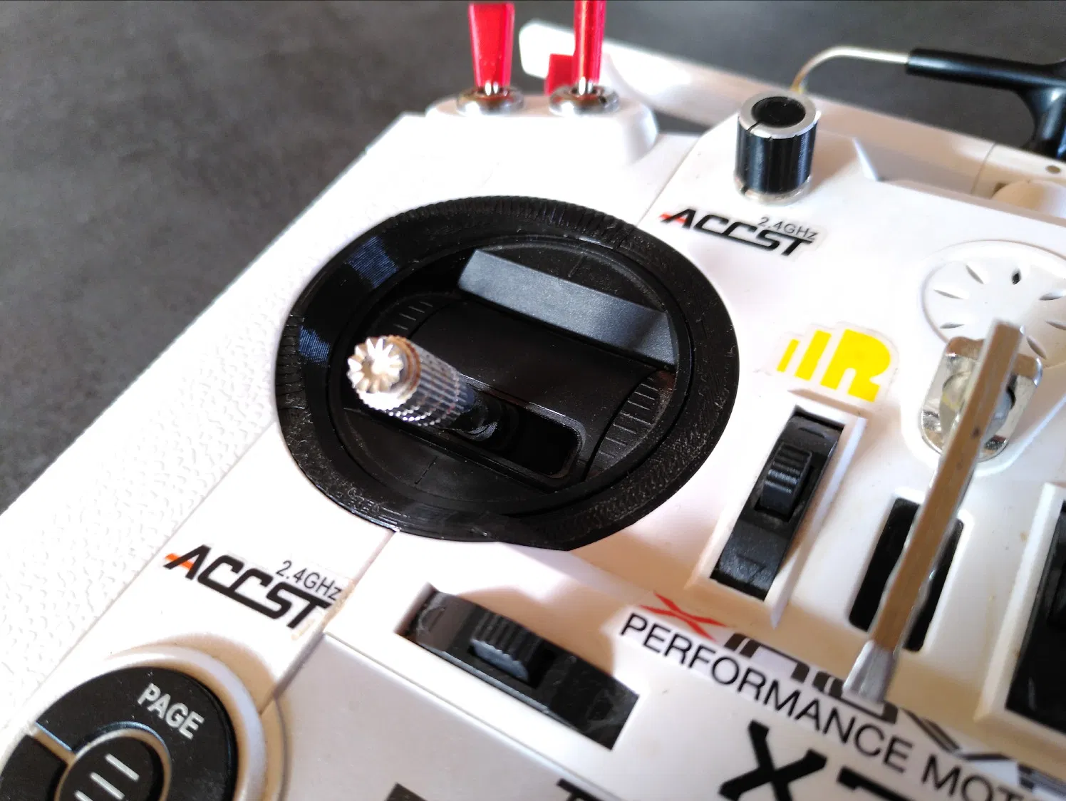 Bộ vòng gimbal low-profile cho Taranis QX7, thiết kế có biên dạng ôm theo bề mặt radio. File chỉ có vòng bên trái; vòng bên phải bạn mirror trong slicer. Kích thước chuẩn để thay thế vòng zin, kèm file Fusion 360.