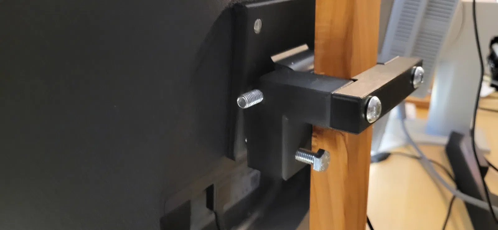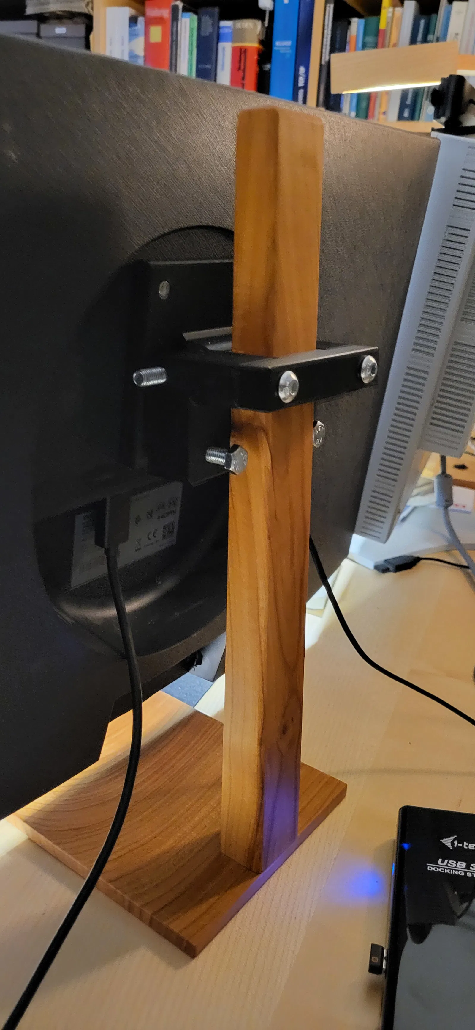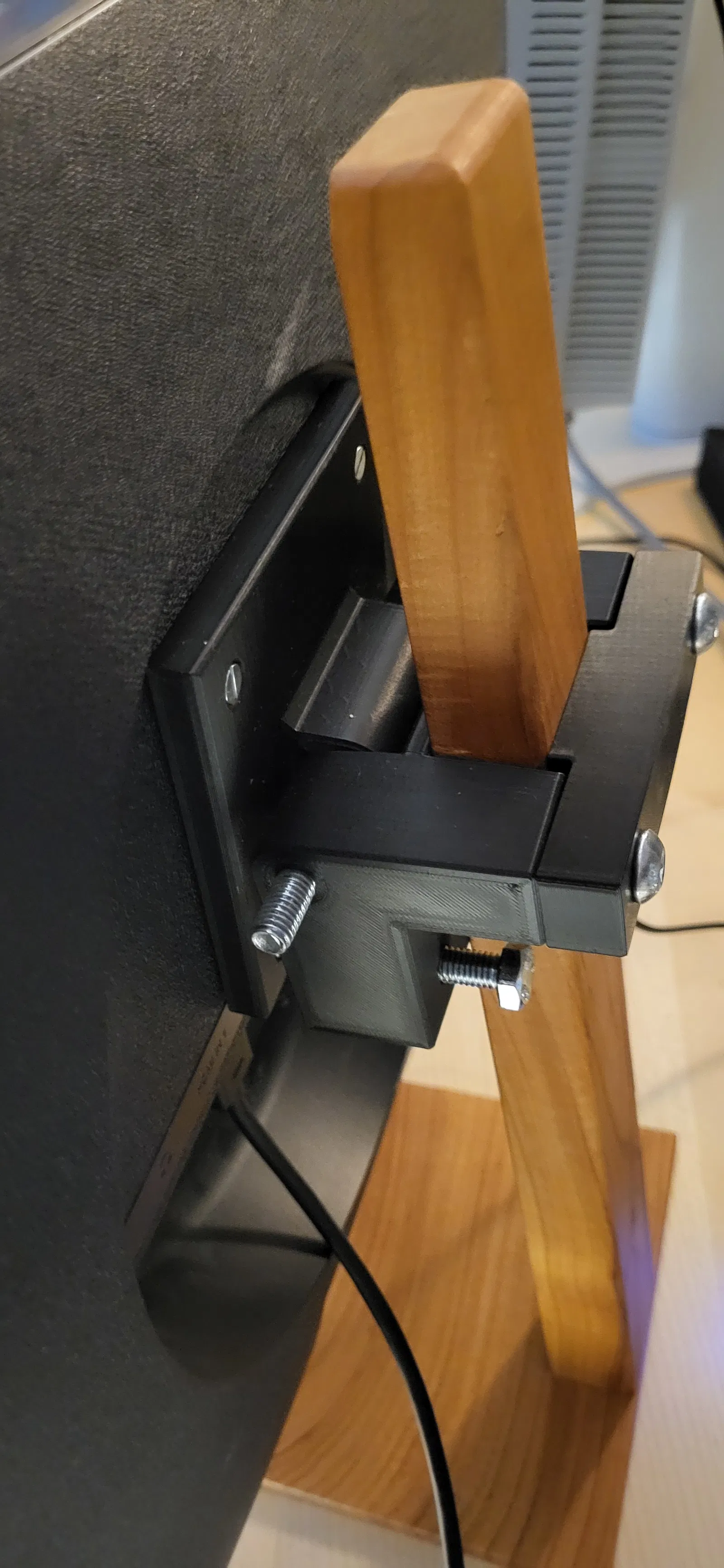 Mình có một màn hình Samsung không chỉnh được độ cao, nhưng lại có ngàm gắn Vesa 70x70. Vì vậy mình quyết định làm một bộ giá đỡ gỗ theo kiểu custom từ gỗ anh đào. Nó gồm một tấm đế và một thanh gỗ vuông dựng đứng, bề rộng hơi nhỏ hơn 44mm một chút. Có 2 loại kẹp đi kèm cho các độ dày thanh gỗ khác nhau: