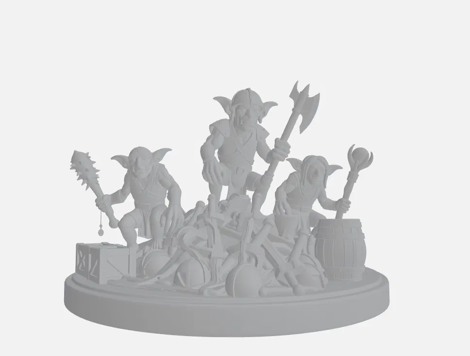 Goblin Gang DnD mini: băng goblin đứng trên đống kho báu, cầm vũ khí, dùng làm mini TTRPG/DnD cho combat. Thiết kế kích thước kiểu creature tile 2x2; ưu tiên nozzle 0,2mm, nozzle 0,4mm vẫn có thể in nếu supports đã chỉnh chuẩn.