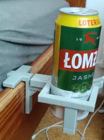 Giá đỡ bia hoặc rượu vang treo lên khung giường. Nên in PETG, 4 perimeter và infill 30%, có supports khi in. Gợi ý dán thêm lớp TPU dày ~1 mm bên trong tay cầm để bám chắc hơn.