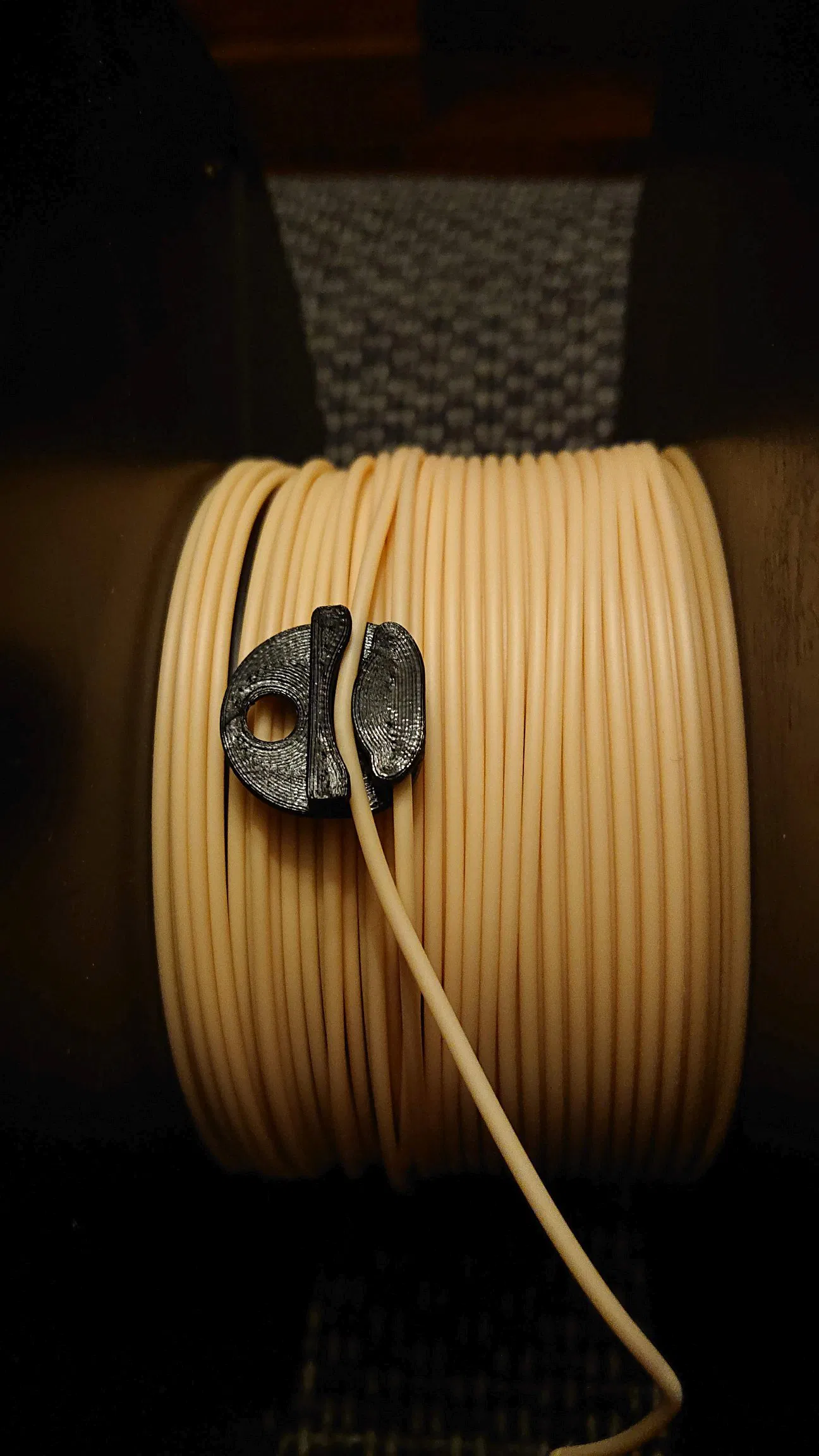 Có lỗ để luồn qua vòng filament trước đó, nên có thể để nguyên khi đang in; đồng thời phần miệng lỗ không có cạnh sắc để filament không thỉnh thoảng bị kẹt.