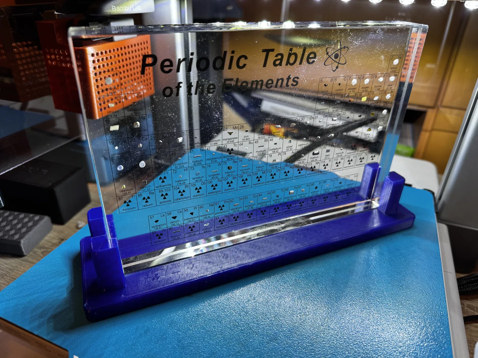 Chân đỡ trưng bày do mình thiết kế cho bảng Tuần Hoàn trong hình, nhưng bạn có thể scale để hợp với nhiều vật khác cần dựng đứng. Mình in bằng Prusament Translucent PETG vì nhìn rất đẹp.