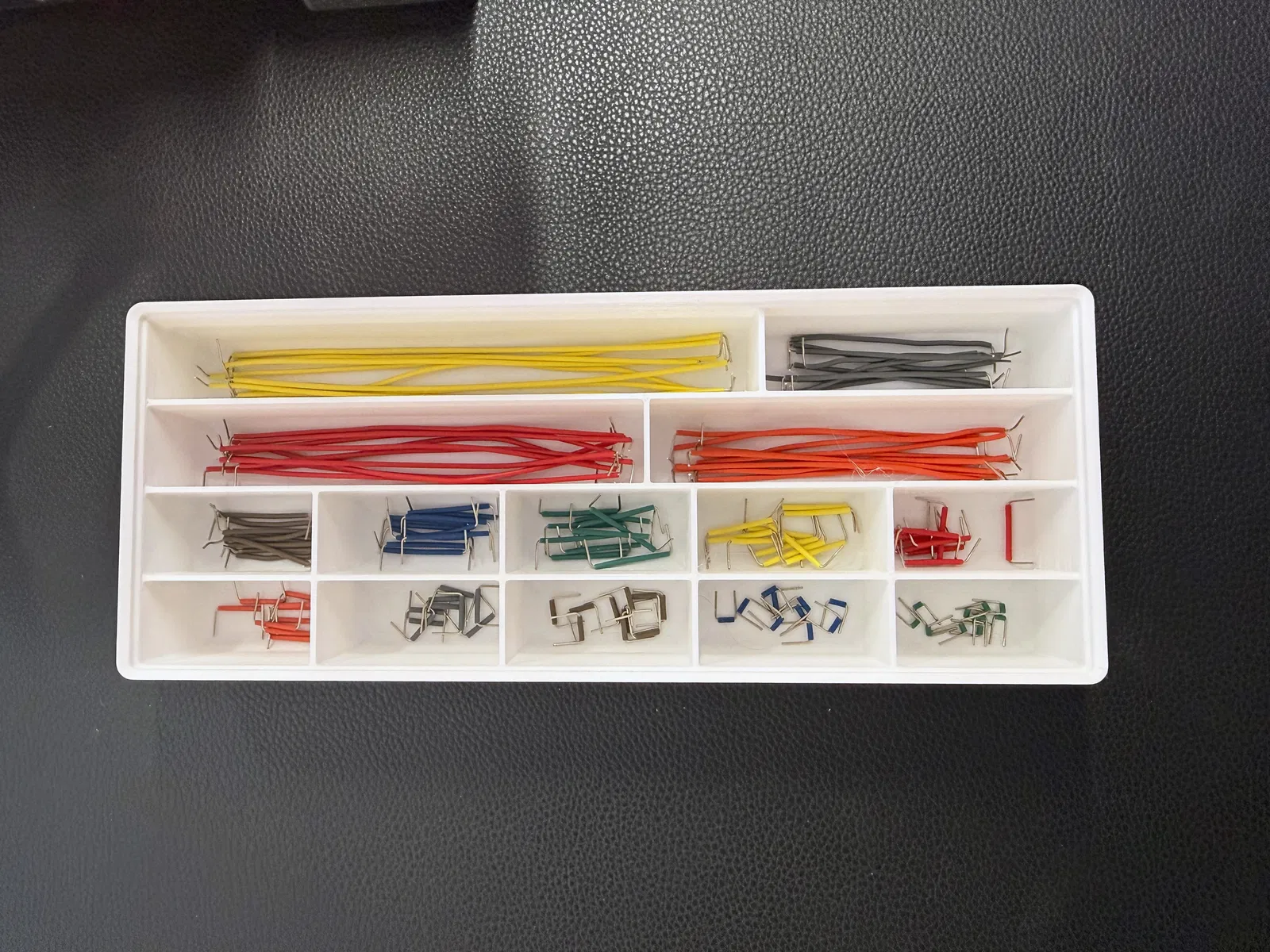 Khay Gridfinity giúp sắp xếp jumper wire loại rigid pre-bent (uốn sẵn, cứng) theo nhiều chiều dài khác nhau. Thiết kế khá sâu, có thể gộp nhiều bộ kit vào chung một khay cho gọn gàng.