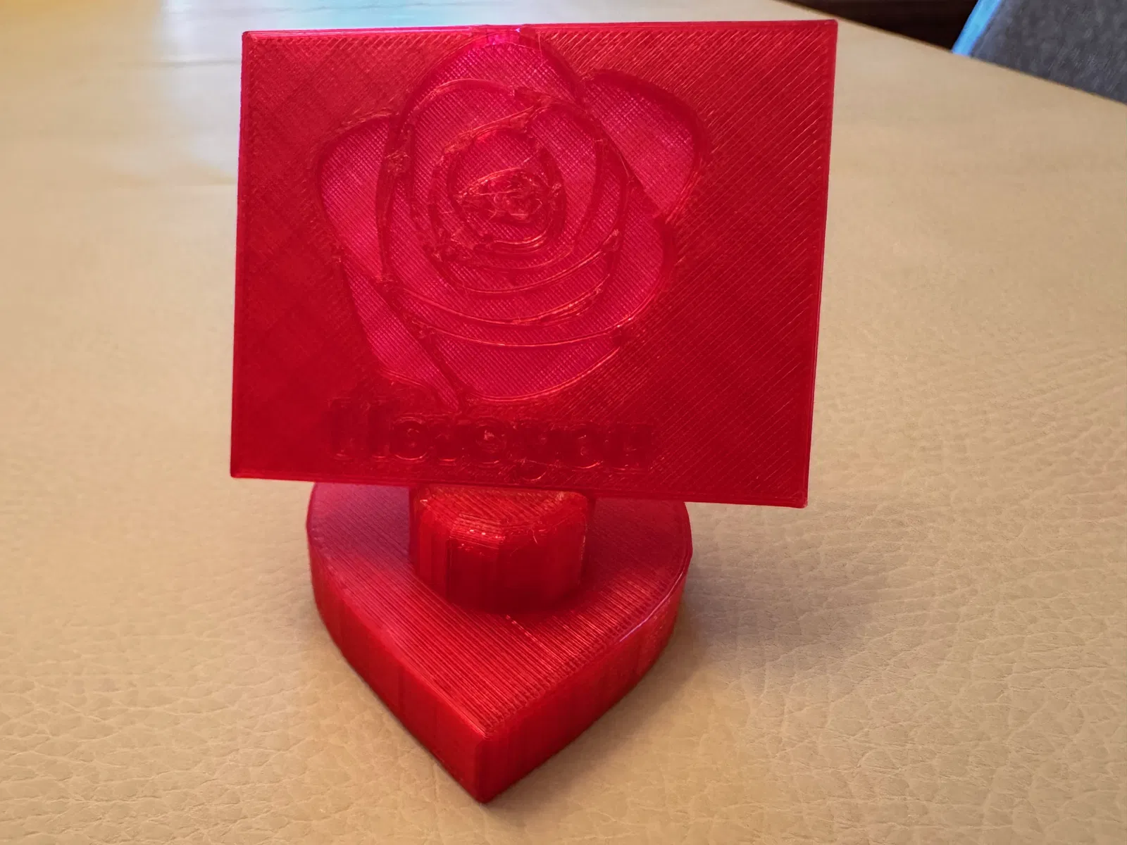 Mẫu kệ đỡ nhỏ có bông hồng và dòng chữ “I love you”. File STL mình để trống phần chữ/hoa, còn file G-code thì đã có bông hồng sẵn trên bề mặt. Phù hợp làm quà Valentine.