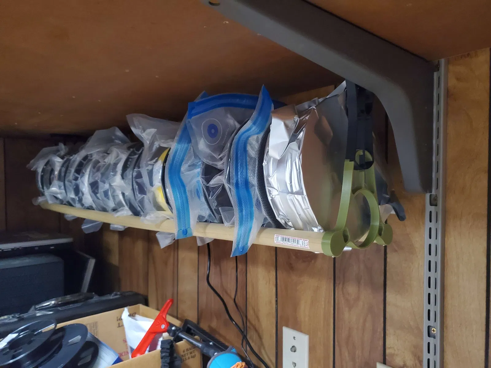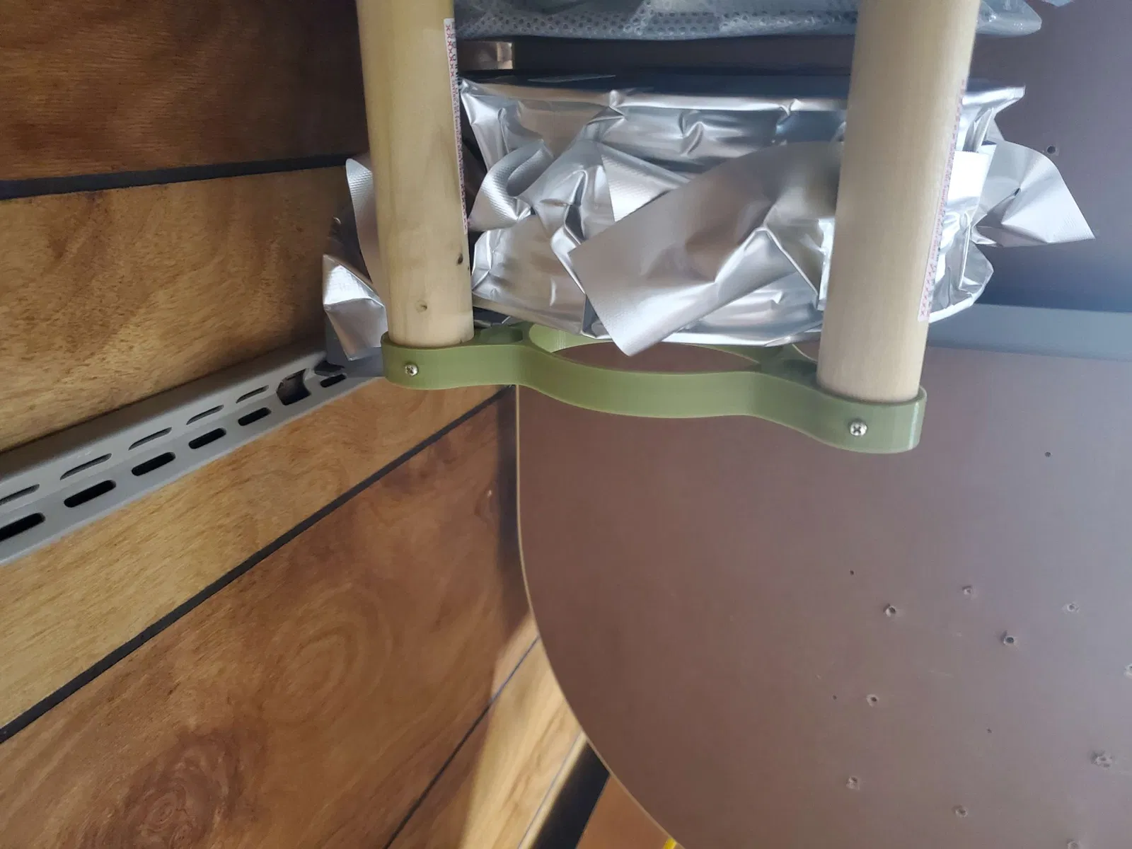 Hai chốt 1 "được chèn vào đế của mỗi giá đỡ. Sử dụng một gỗ nhỏ để buộc chúng vào vị trí (các lỗ vít nằm ở phía dưới nơi mỗi chốt được chèn).