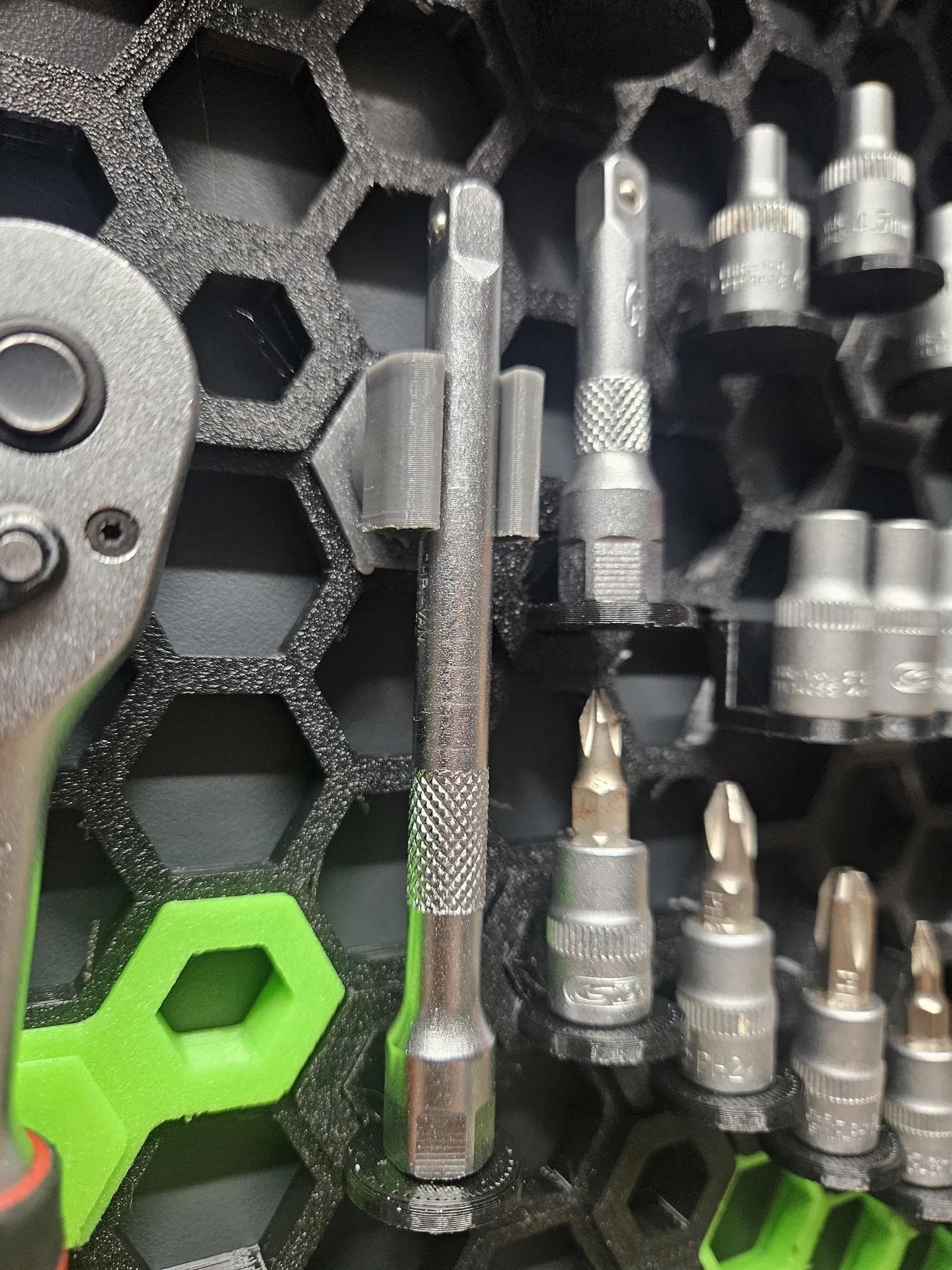 Kẹp giữ nhỏ gọn cho thanh nối (extension) ratchet 1/4 inch, tương thích Honeycomb Storage Wall. Thiết kế dạng clip bấm khớp giúp giữ chắc, không rơi tuột như holder mở, gọn gàng cho khu vực treo đồ nghề.
