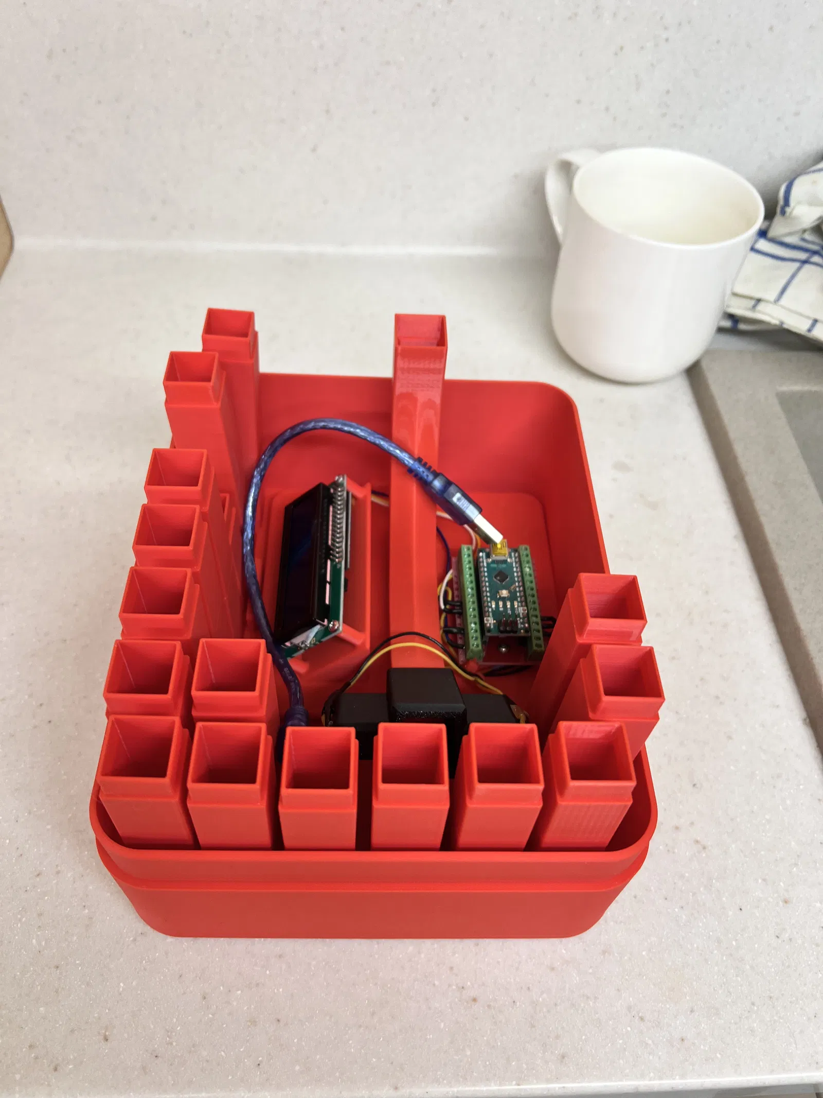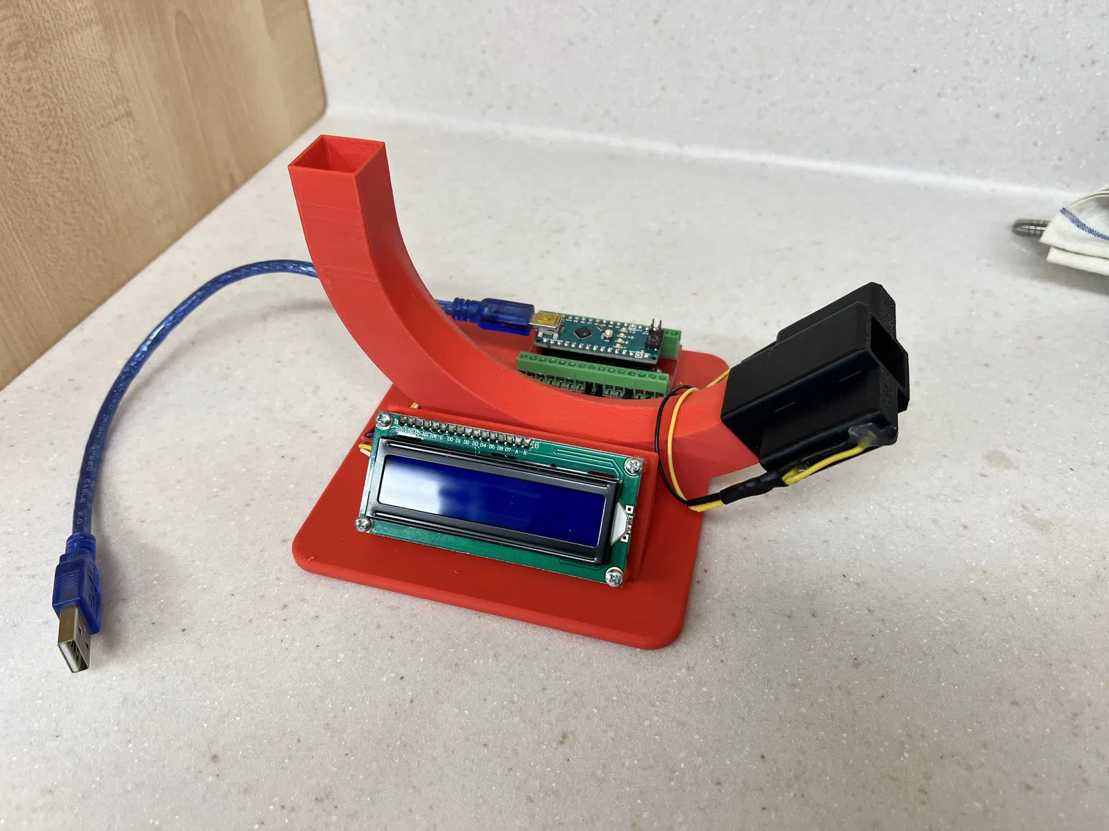 Arduino Nano được gắn trên một expansion board có thể dễ dàng mua ở các shop đồ robotics hoặc trên Aliexpress, v.v. Màn hình là loại 1602 2 dòng kết nối I2C, hiện vẫn rất rẻ và dễ mua.