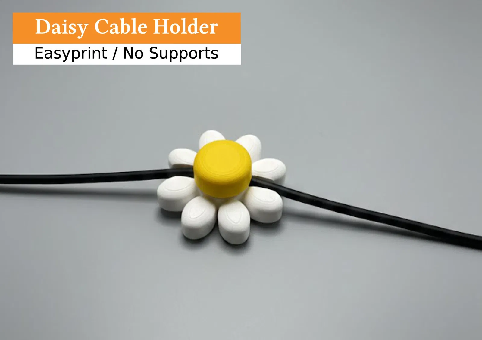 Kẹp dây hình hoa cúc (Daisy) vừa xinh vừa tiện, giúp giữ dây sạc/dây thiết bị khỏi tuột ra sau bàn. Có 2 size Large/Small, gắn bằng vít hoặc băng keo hai mặt. In PLA/PETG, 0.2mm, không cần support.