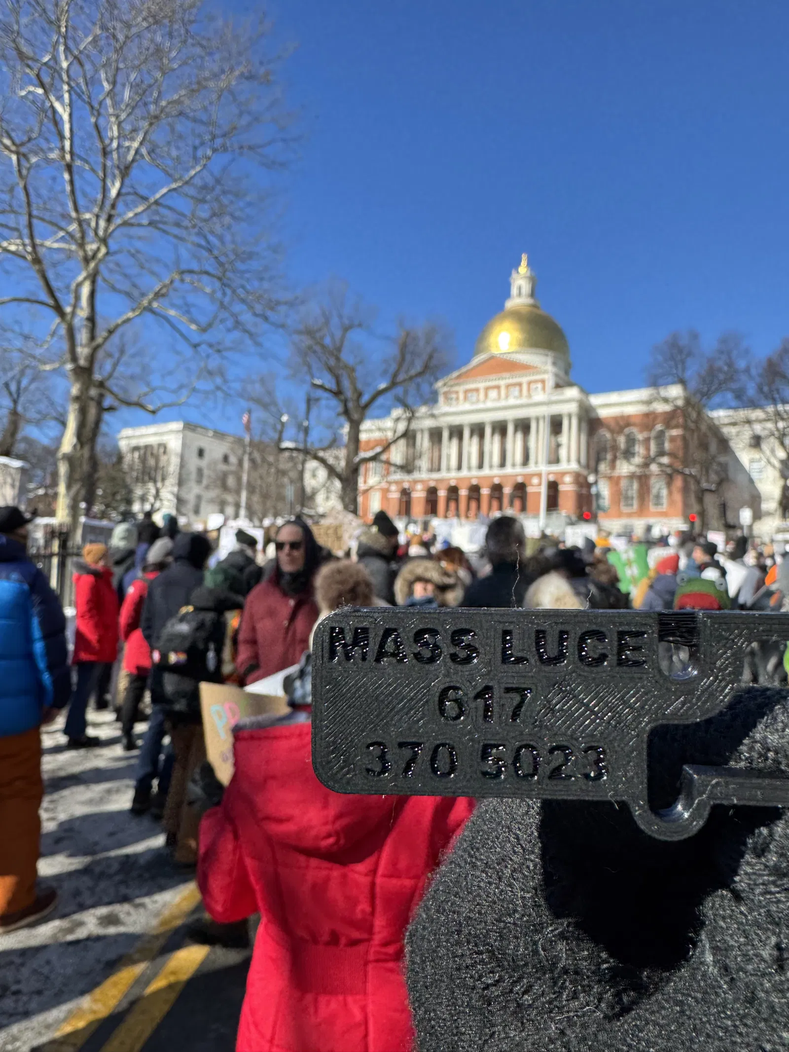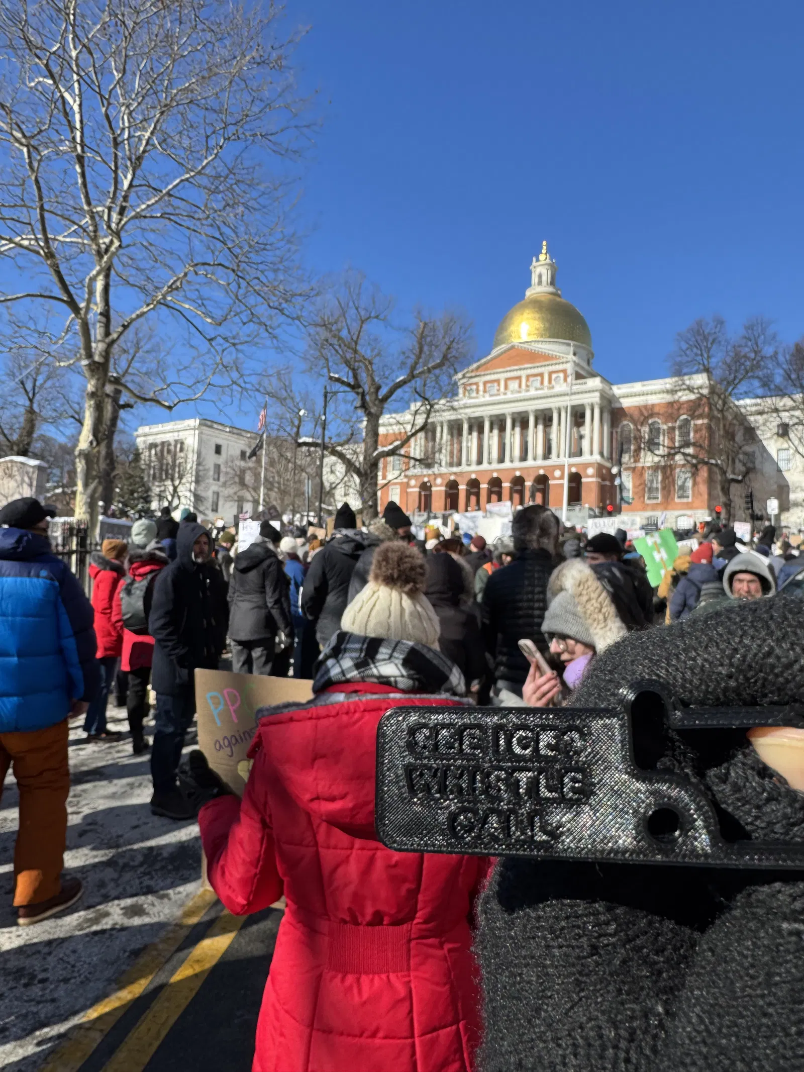 Mẫu còi carabiner “No Ice” có khắc hotline Massachusetts LUCE. Dễ gắn móc khóa/đeo cổ, dùng làm tín hiệu cảnh báo khi ICE xuất hiện: thổi ngắt quãng khi ở gần, thổi liên tục khi có vụ bắt người.