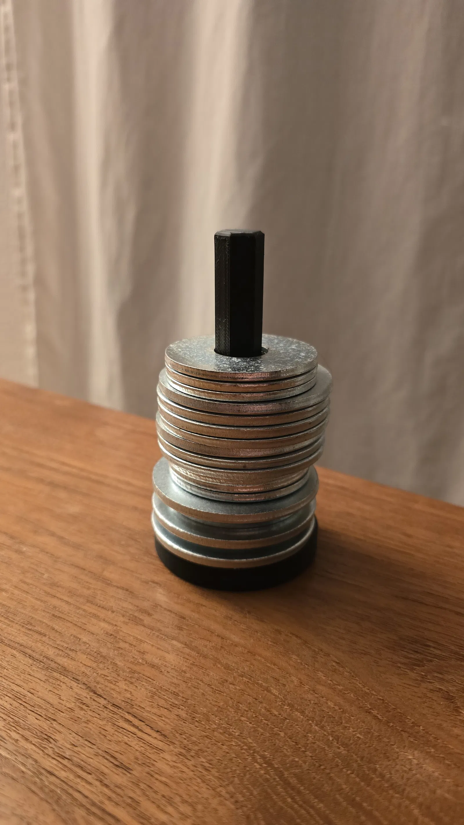 Để đè giữ rập may khi cắt vải, mình dùng mấy cái washer cỡ lớn cho ốc M16 trở lên. Thiết kế này đơn giản, để xếp chồng các washer lên nhau.