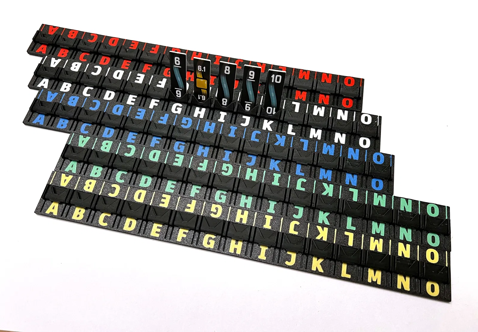 Đây là một khay/giá giữ tile chức năng cho board game Bomb Busters, có cơ chế lật tương tác vận hành bằng các nút nhấn nhỏ, giúp các tile/card nghiêng về phía trước một cách dễ dàng.