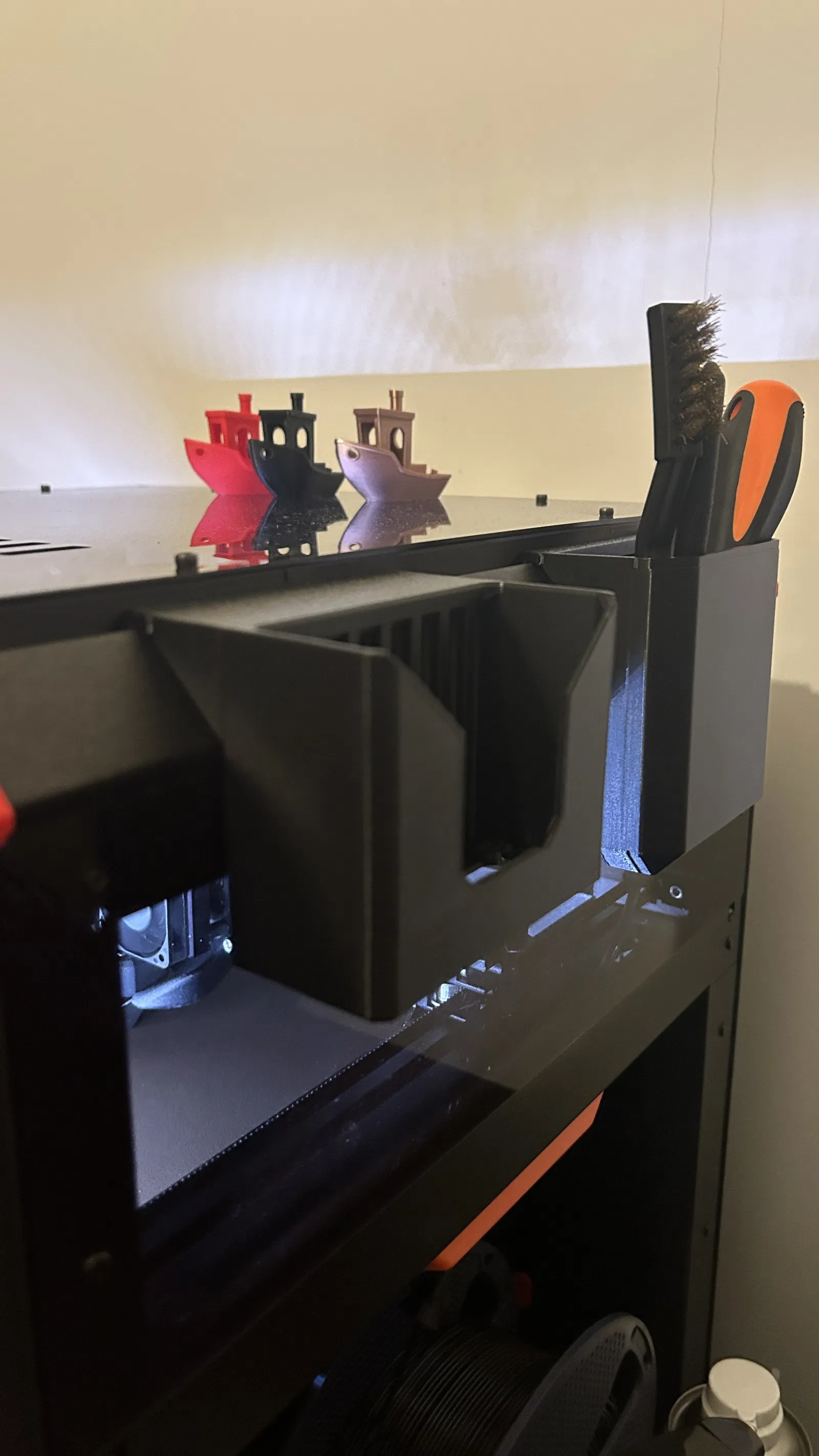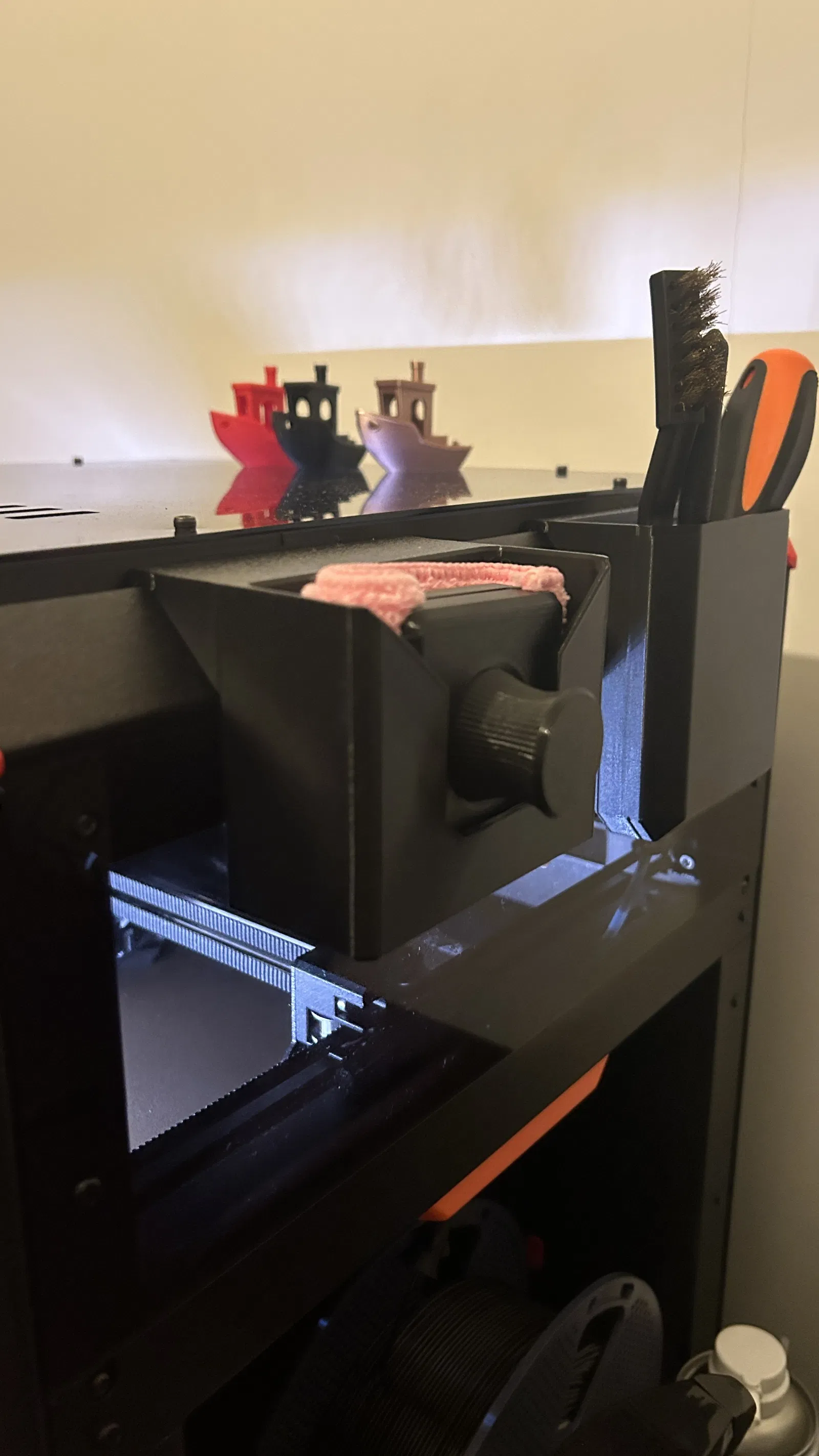 Giá đỡ Cleaner cho Prusa Core One, bản remix có thêm móc để cố định vị trí và dùng nam châm tròn 10x3 mm (có thể dùng ít hơn 10 viên). Khuyến nghị in PETG, PLA cũng dùng được.